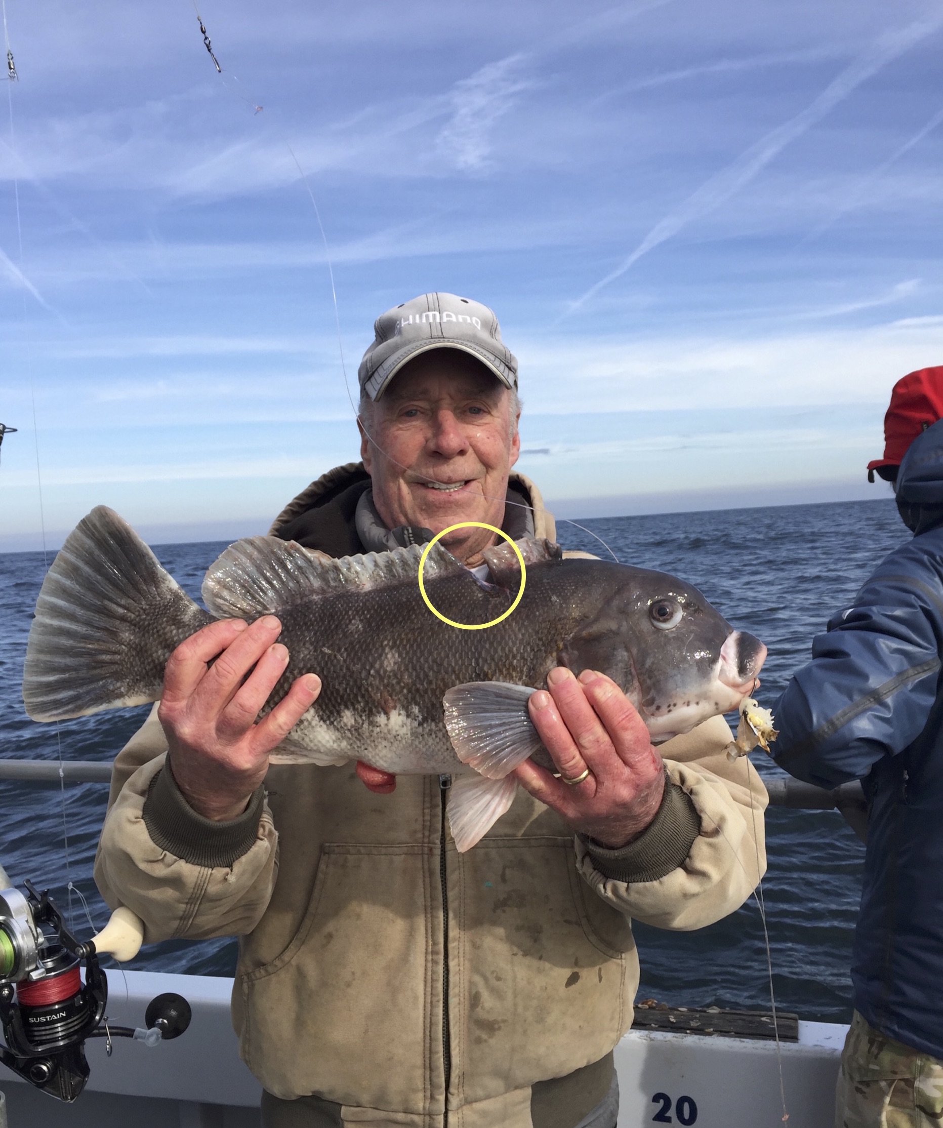 Captain Monty put some anglers on some nice tog yesterday as well. In the second photo, Smelts Murphy (yes, that’s his real name!) caught a nice tautog. The fish appeared to have possibly had a close call with a spear gun last summer (yellow circle).