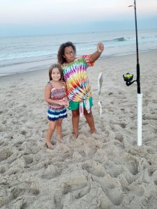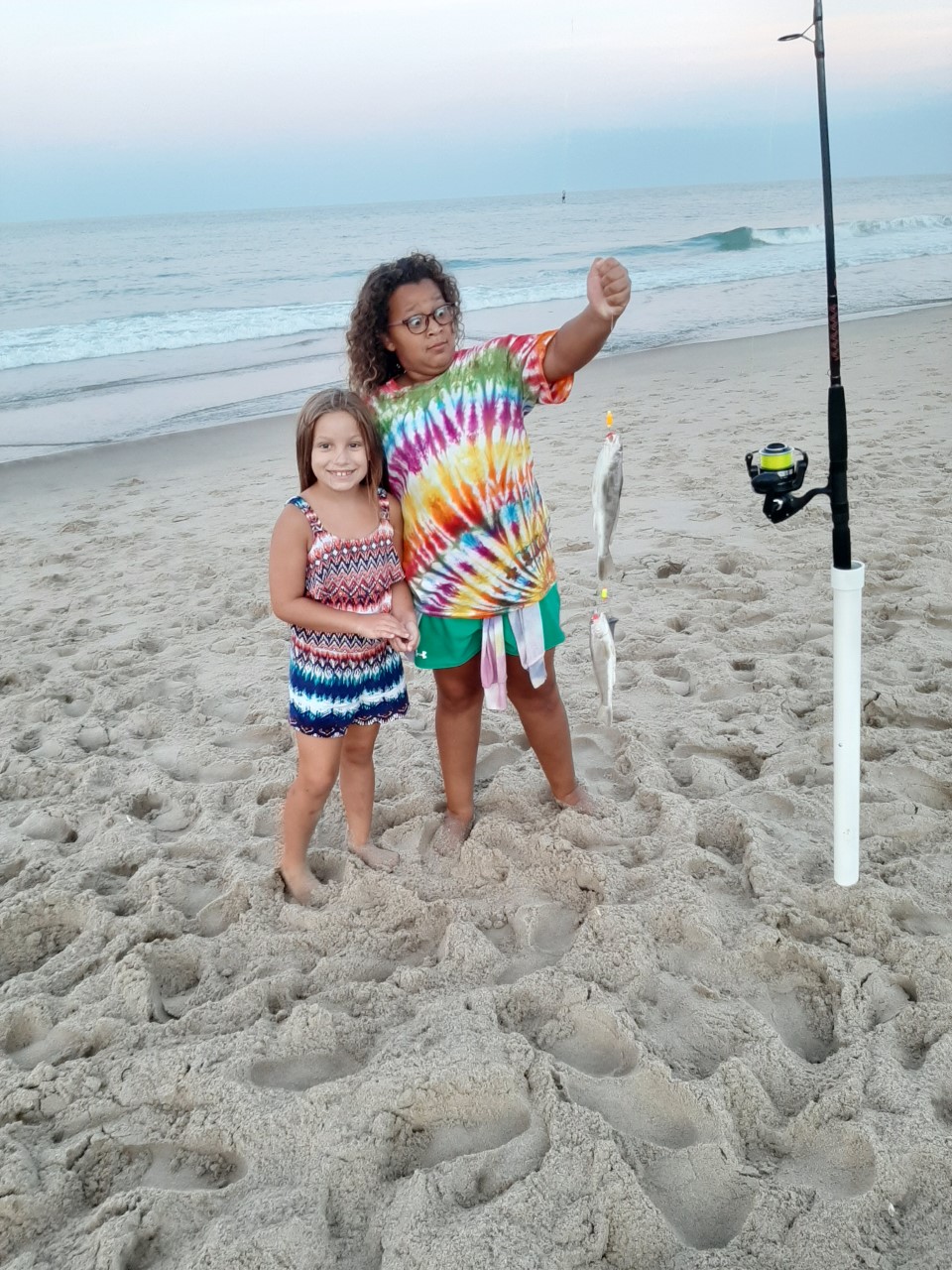 Tim Foote caught this awesome picture of Kayci and Miley who were a little surprised by a double of kingfish that they caught on the beach this morning on our Fish in OC Croaker Smoker rig.