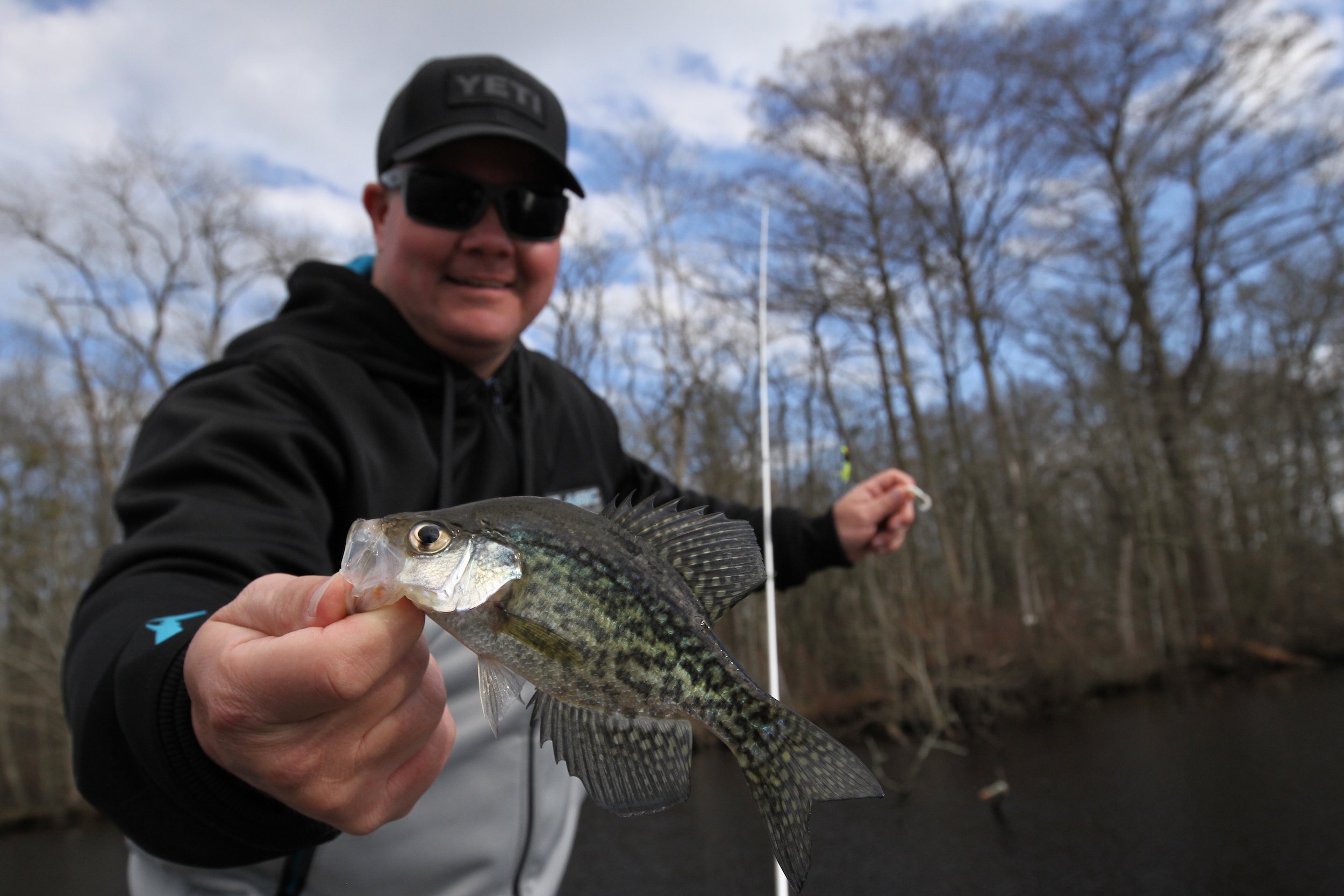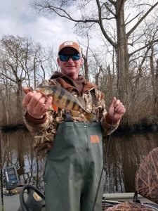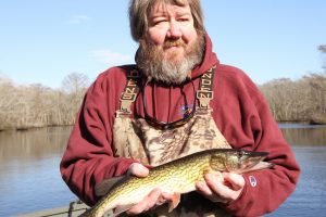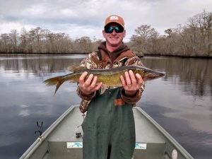 Yesterday was a much better weather day with light winds and warm temperatures. There was some cloud cover and the occasional rain drop early, but temps got into the upper 50s and the wind wasn’t bad. With the forecast for the weather that is on it’s way it was a great day to get out and enjoy some fishing. I got a chance to head down to the Pocomoke river on the Buffalo Hunter Guide Service with my good friend Captain Brian Behe, John Wittmyer from Crabs to Go and Dave Messick of Hooked on OC to shoot a new episode of the show to keep things rolling through the winter. We had a great day on the river where Captain Brian caught a nice bass, Johnny slayed the chain pickerel and I even got to land one of my favorite fresh water fish the black crappie. There were several other boats on the river as well and it seemed like fishing was good for small panfish. Johnny provided a nice lunch of crab cakes from Crabs to Go that Captain Brian cooked up for us right in the boat and as usual Dave Messick got some reely nice pics. If you’re looking for something fun and productive to do this winter to shake off the doldrums Captain Brian provides a great trip.
