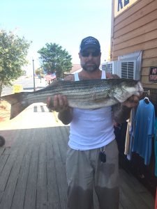 Bear down at the Oceanic Pier sent me this photo of John who got it done in the back bay again this morning. John used a Zoom artificial to catch this 31″ rockfish from the sea wall behind Ocean City.