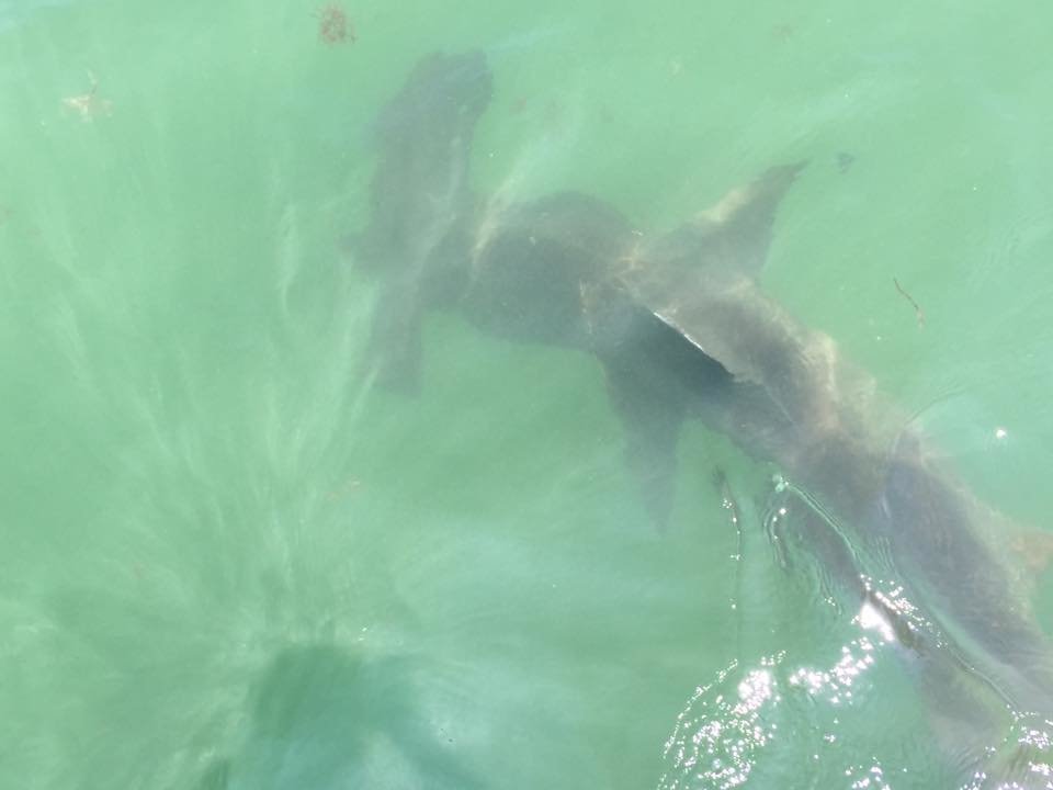 Anglers that were fishing the Ocean City inlet were also treated to an unusual guest this afternoon. There was a pretty decent sized Hammerhead shark spotted by several anglers fishing the inlet and back bays, and Captain John on OC Guide Service was close enough to capture a video of the fish cruising the inlet. Here’s a photo of the Hammerhead next to the OC Guide Service…