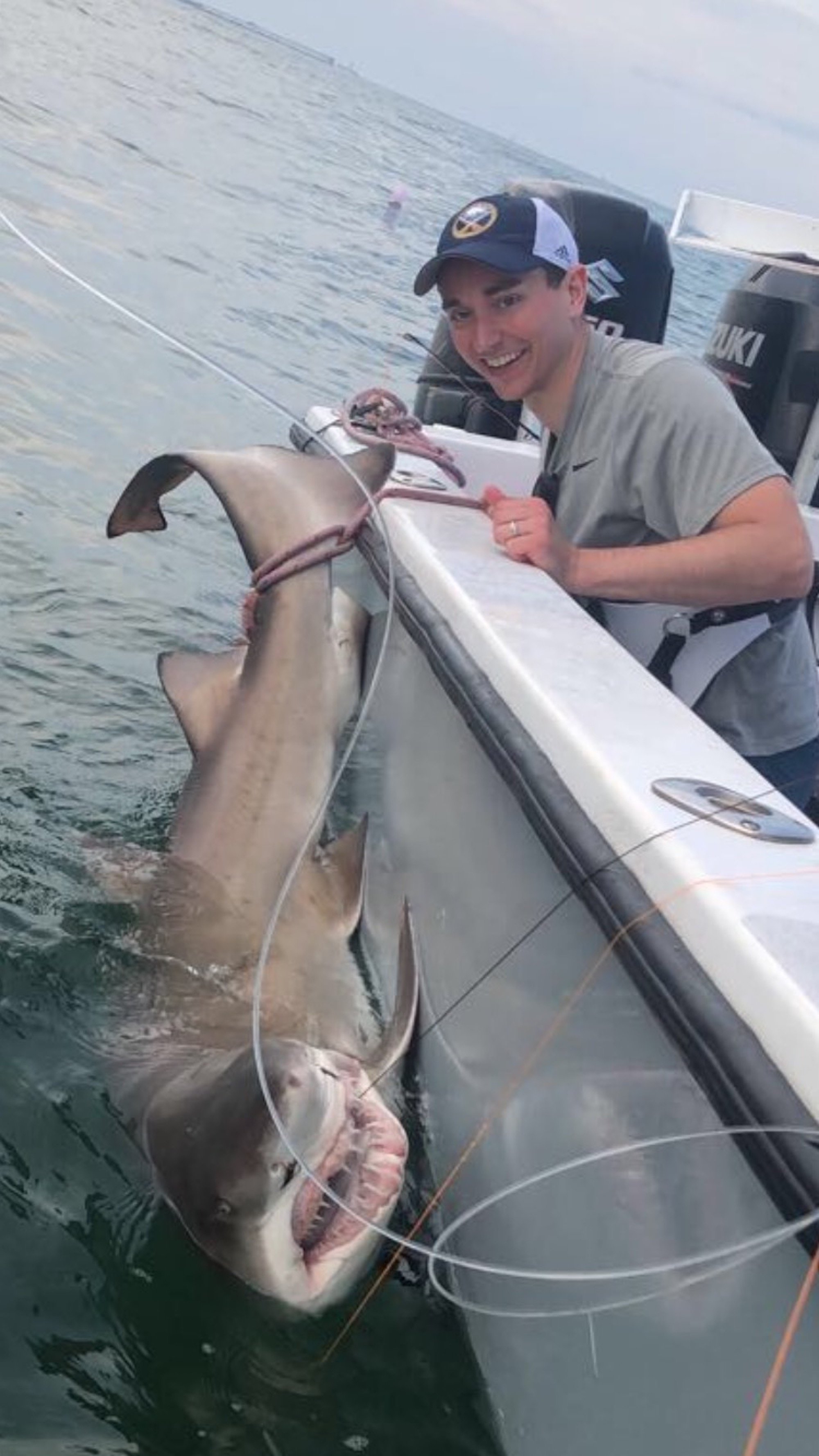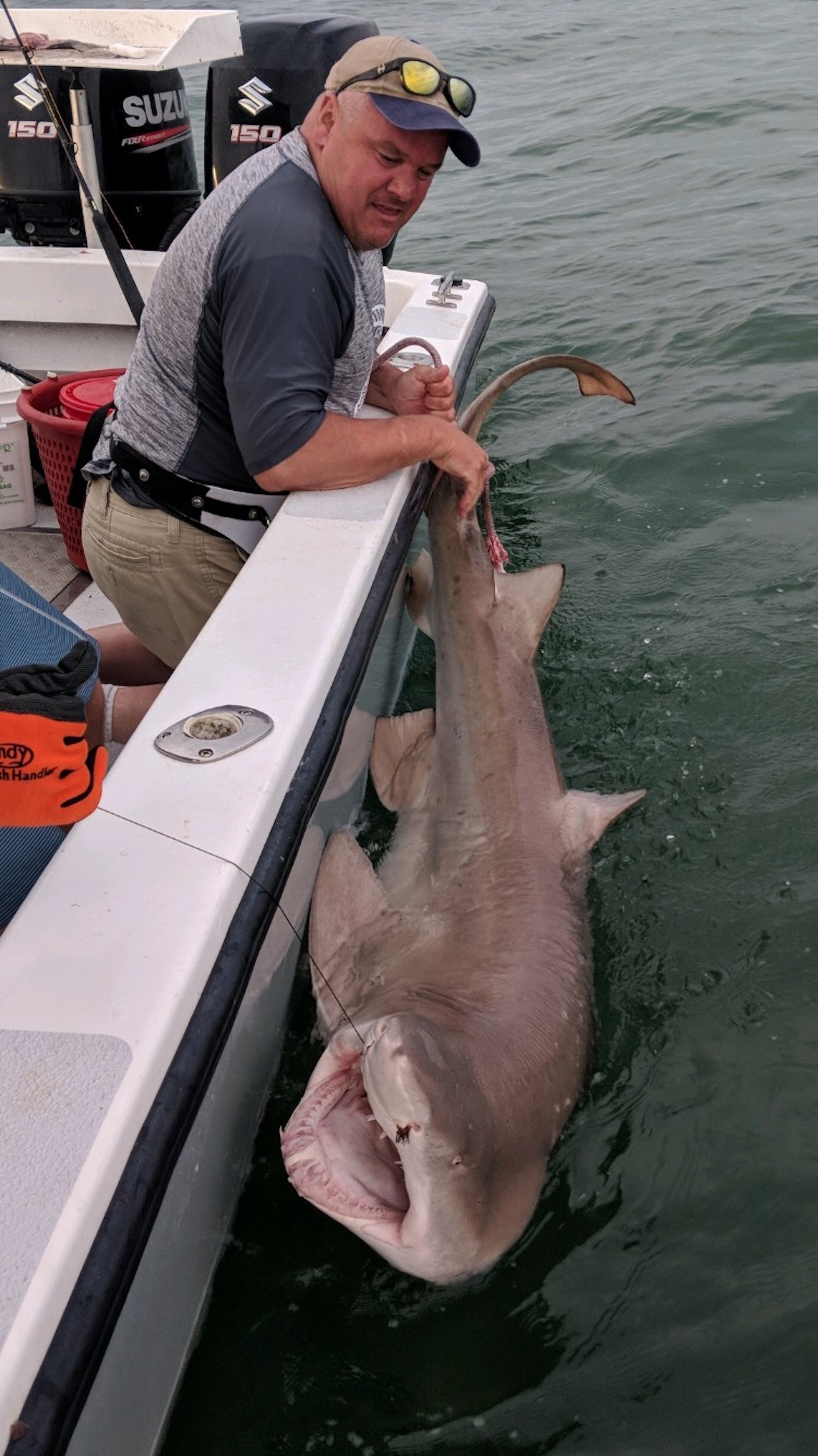 Captain Chase Eberle of Chasin’ Tides Charters had a productive inshore shark fishing trip today where his crew released some big sandtiger sharks and got to see a whale up close and personal.
