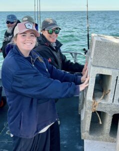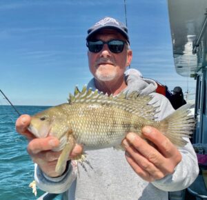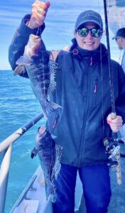 Fishing began well enough. Shorts were plenty hungry; keepers came over the rail too. Long about 11 three anglers got into double digits (10 or more of their 15 fish limit) with Emily among them. Nothing wrong with using reef-builder’s karma to advantage. She was high hook too! Fore and aft of her were nameless gentlemen who did not possess said luck. Fortunately they were good sports about it.