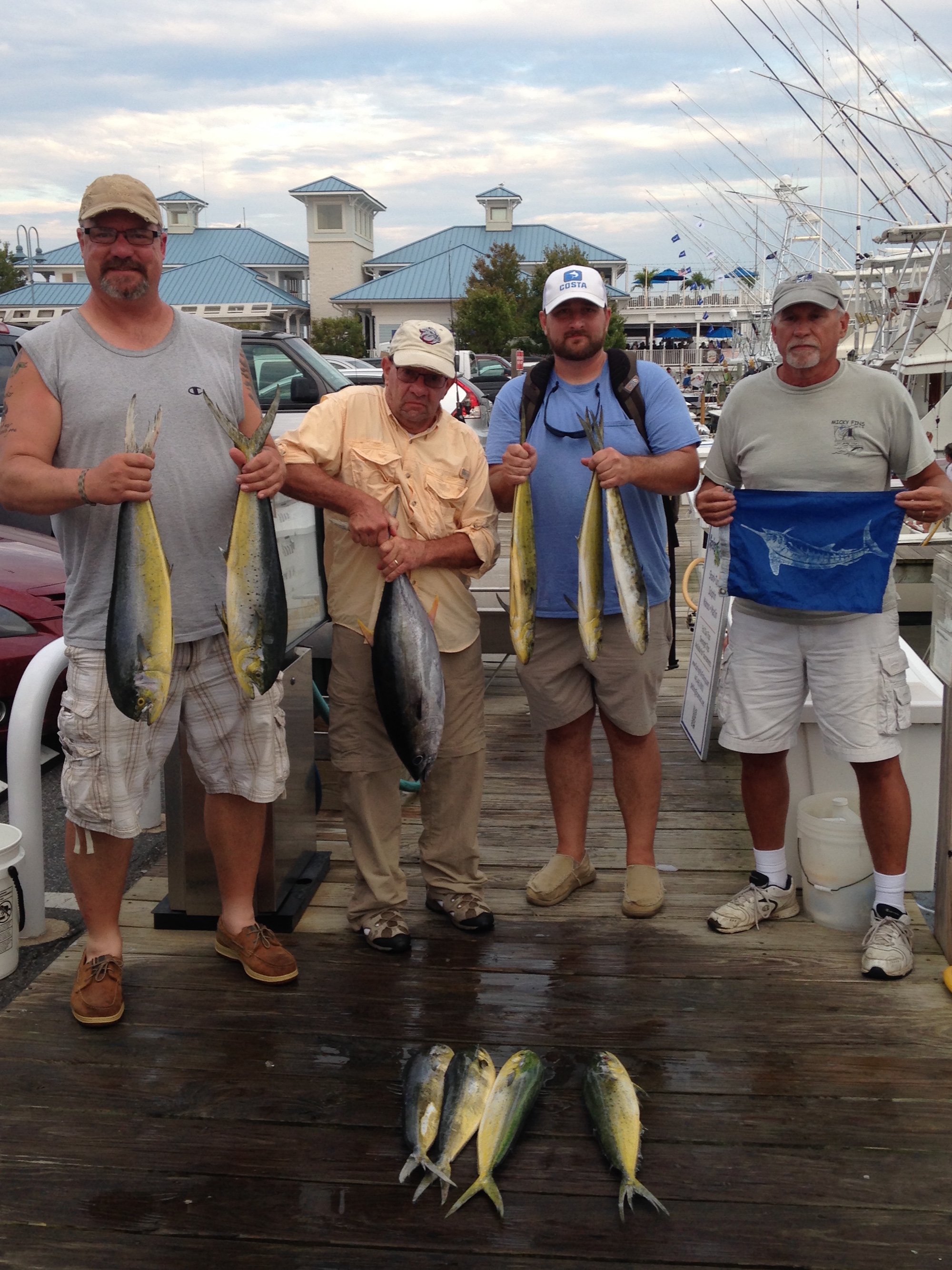 Chess Hedrick and his crew had a enjoyable fish catching day on the charter boat MARLI with Captain Mark Hoos and mate Mark Stephens. They boxed 29 mahi and released four white marlin. The action was steady thru out the day. The remaining mahi not in the photo were already delivered to the fish cleaner.