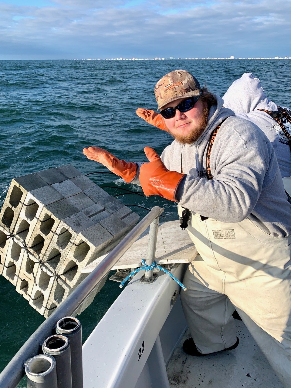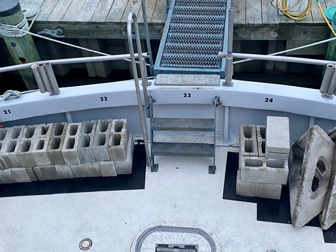 Dropped thirty blocks & four reef pyramids, then set two anchors.
