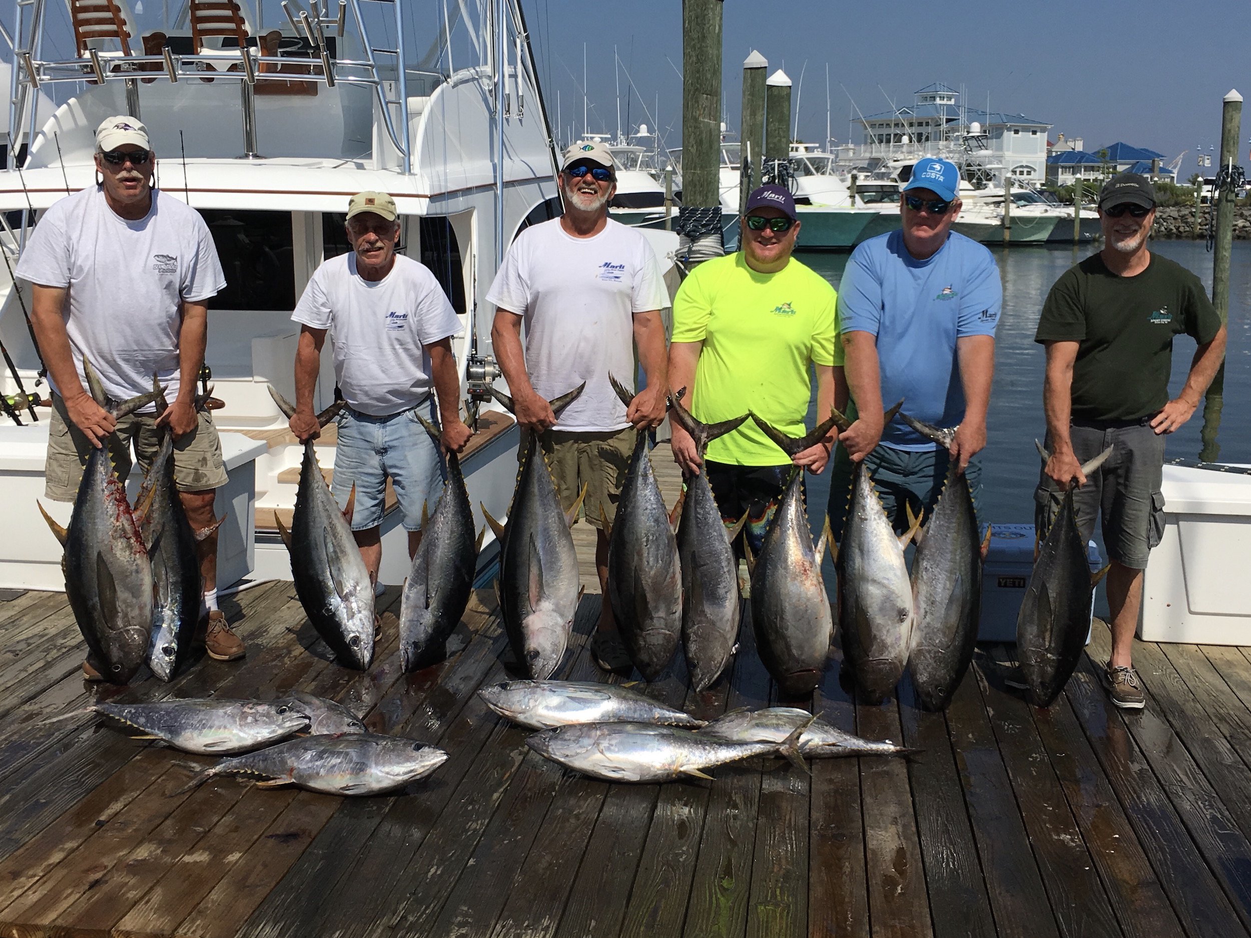 Mike Bostic and his Church Hill, Maryland crew whacked the yellowfin tunas on the charter boat MARLI with Captain Mark Hoos and mate Mark Stephens today. The tunas couldn’t resist the tasty butterfish used for bait. The bite is on and the weather is great. It’s tuna time!