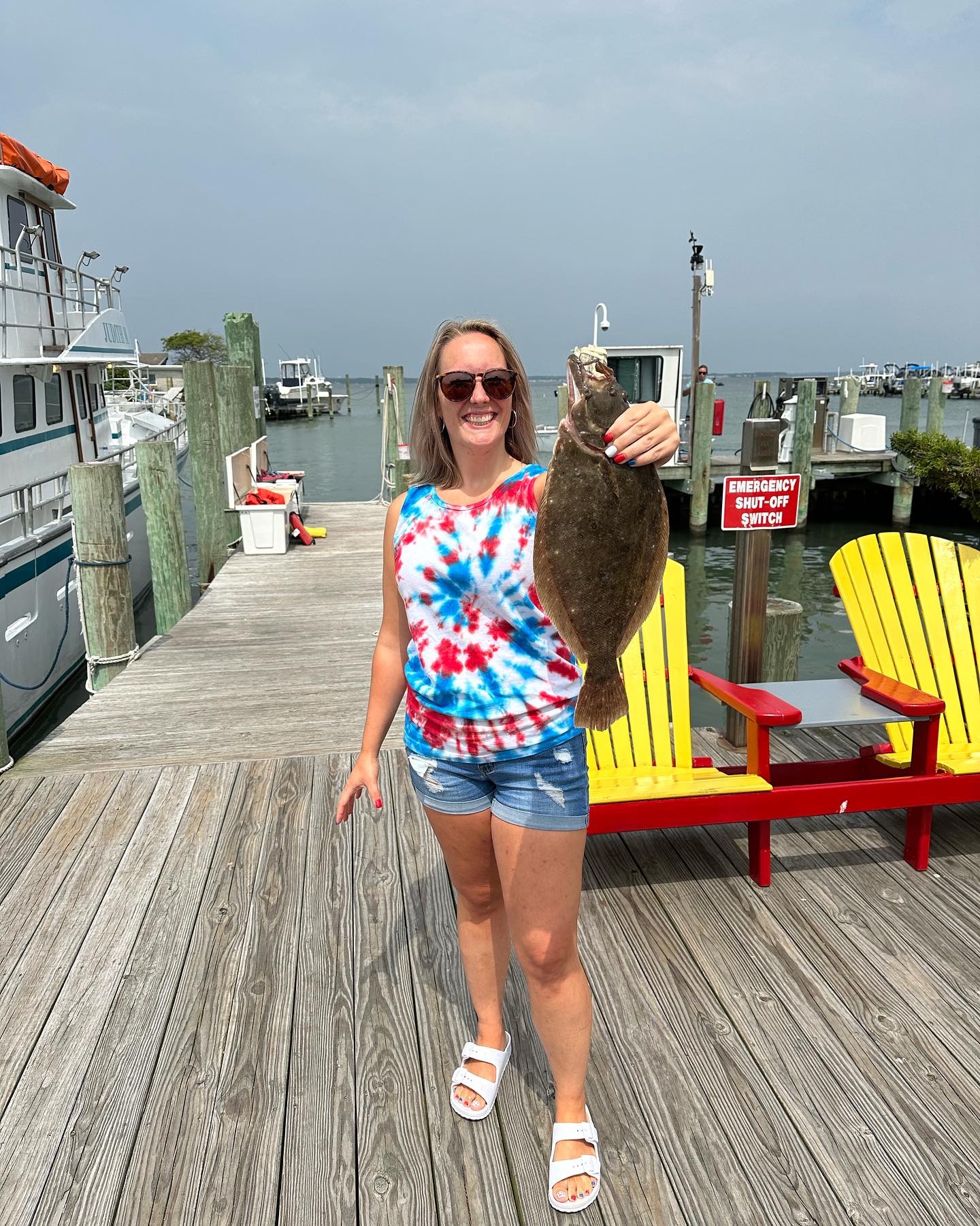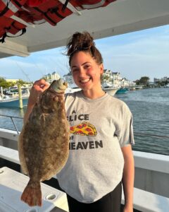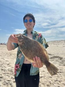 Max Canlins sent in this pic of his buddy Enqi who landed a keeper flounder in the Assateague surf on a swim shad.