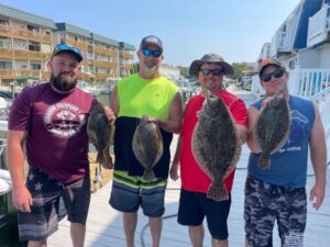 Afternoon in the breeze, outgoing tide and a chop on the bay, Dave Neumayer was able to treat these fellas (all of them from Adams County, PA) Sean Boose, Chet McCormick, Kevin Wolff and Nate Hartlaub to some flounder. All caught at Harbor Island on live spot. 22”, 18”, and 2-16 3/4″.
