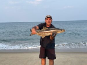 Maurizio Lenzi caught and released the first cobia that I’ve seen so far this year when this 31″ fish ate a piece of fresh bunker in the surf on 120th street yesterday. The fish was released since it was under the 40″ minimum size. Many thanks to Larry Budd of Coastal Fisherman for the photo and report!