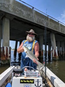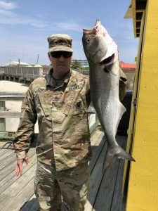 Bear down at the Oceanic Pier had some more bluefish action today on the outgoing tide. Aaron Jones of Salisbury, MD stopped by the pier today and landed this BIG bluefish on a live minnow. Thank you for your service Mr. Jones!