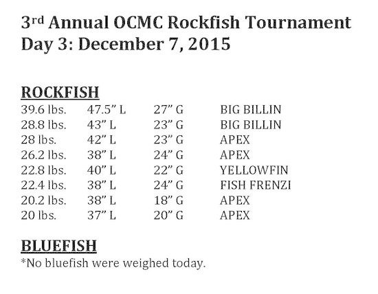 Day three of nine is in the books for the 3rd Annual Ocean City Marlin Club Rockfish Tournament and some more fish hit the dock this afternoon. The crew of the Apex was showing their Christmas spirit when they hit the dock today with some nice fish. Here’s how it breaks down after three days of fishing.