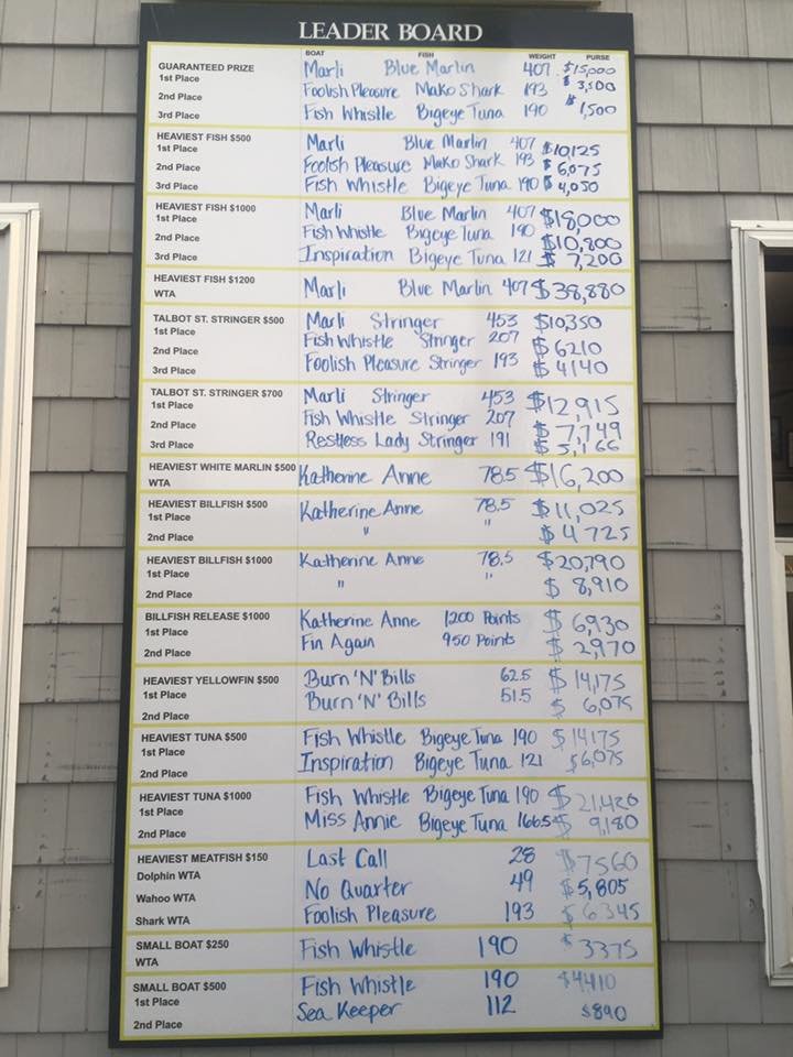 The “Big Fish” of the tournament came in today and was weighed by Fish in OC charter Marli with Captain Mark Hoos and mate Mark Stephens. The crew of the Marli posted the only qualifying blue marlin of the tournament at 407 pounds. Marli won 1st Place Big Fish and including all of the added entry levels won over $105,000!! Congratulations to Marli and crew!