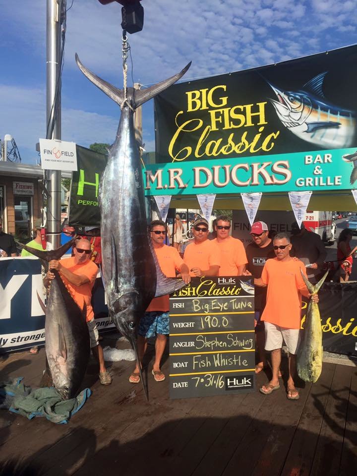 My buddy Tommy Hinkle and the crew of the Fish Whistle had a great day out in the deep for the BFC. The crew of the Fish Whistle missed the mark with a non qualifying blue marlin, but the bigeye tuna that weighed 190 pounds won them quite a bit of money. After adding entry levels to 3rd Place Biggest Fish the crew of Fish Whistle won over $73,000.