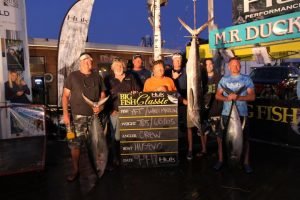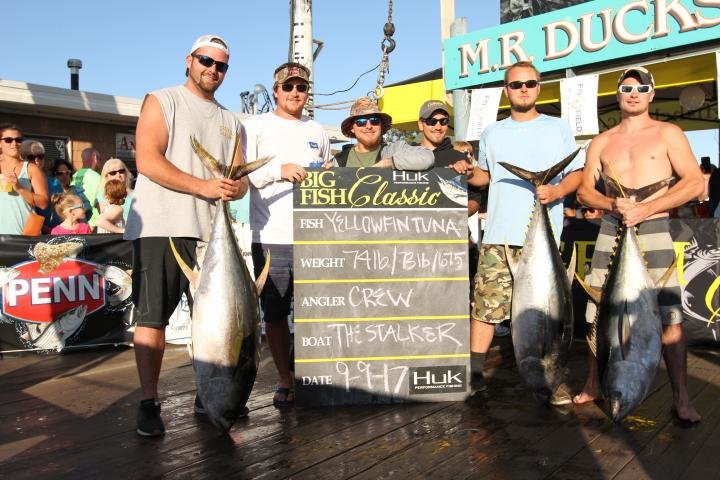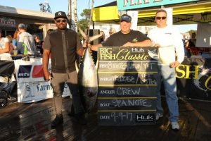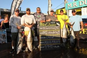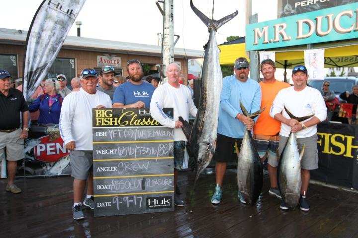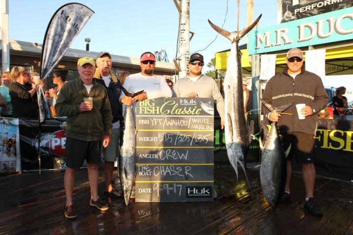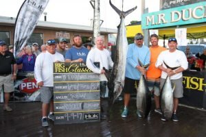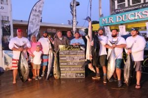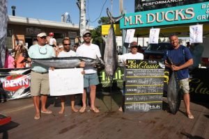 Yesterday at the HUK Big Fish Classic at the Talbot Street Pier there was nothing going on. We had one white marlin come to the scale that didn’t meet the 67″ minimum length required for the tournament, so it wasn’t weighed….and that was it. Being that boats were allowed to fish a 32 hour window from lines in at 7 AM yesterday until lines out at 3 PM today, we had a feeling that lots of boats would choose to fish overnight and that today’s scales would be busy….we were right. 34 of the 40 boats registered for the tournament fished the first 32 hour window that ended today at 3 PM and tonight we saw a bunch of fish at the scales. Here are some unofficial standings for the 4th Annual HUK Big Fish Classic as of today. Big thanks to my partner in crime Dave Messick from Hooked on OC for the great shots!