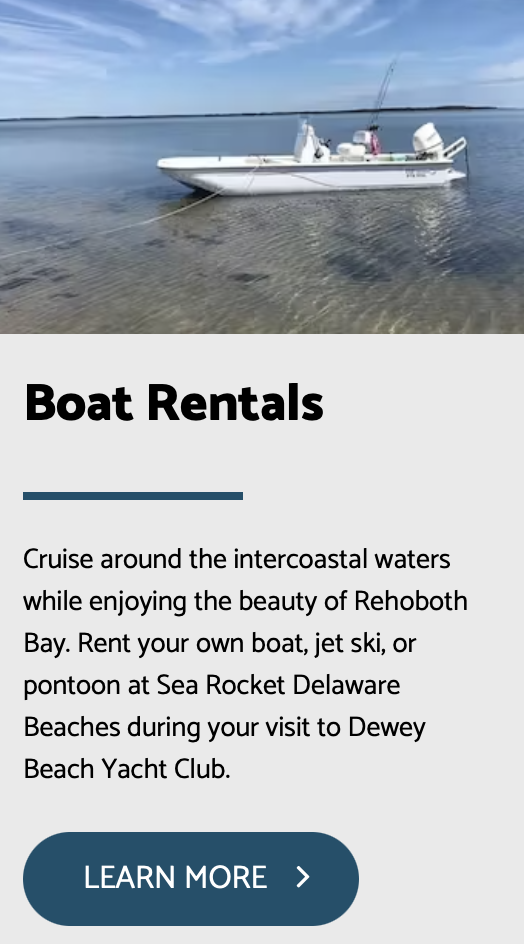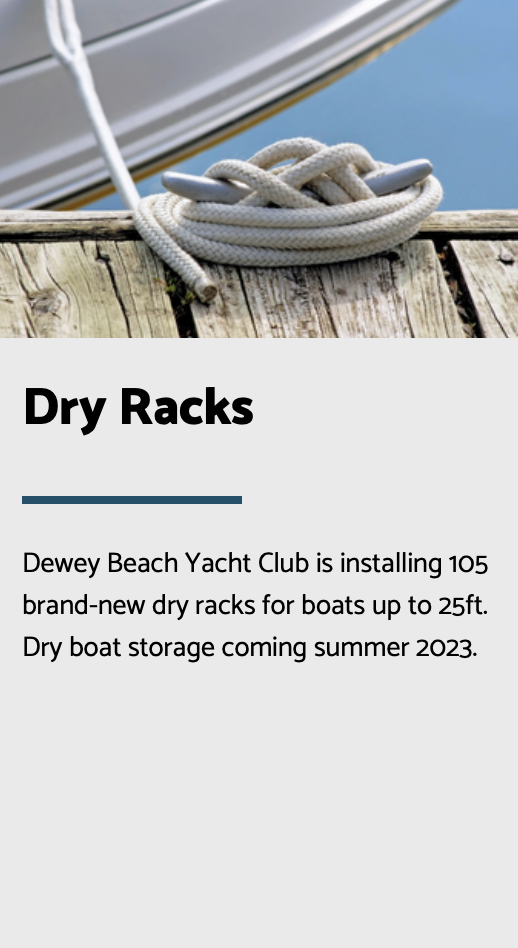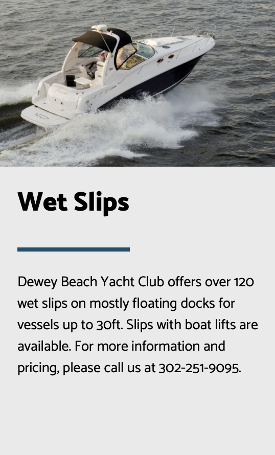 Located in the heart of Dewey Beach, DE, and on the shores of picturesque Rehoboth Bay, recreation on the water is redefined at Dewey Beach Yacht Club. We provide first-class floating docks, boat lifts, and wet slip rentals. After a multimillion-dollar renovation, guests will benefit from recent improvements and enjoy luxury amenities, including a Ship Store, new bathrooms, boat rentals, luxury condo rentals & more, with a pool and clubhouse coming in 2024!