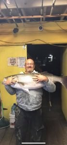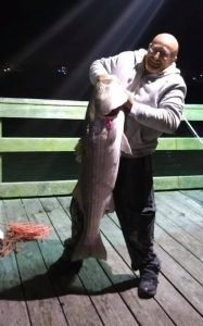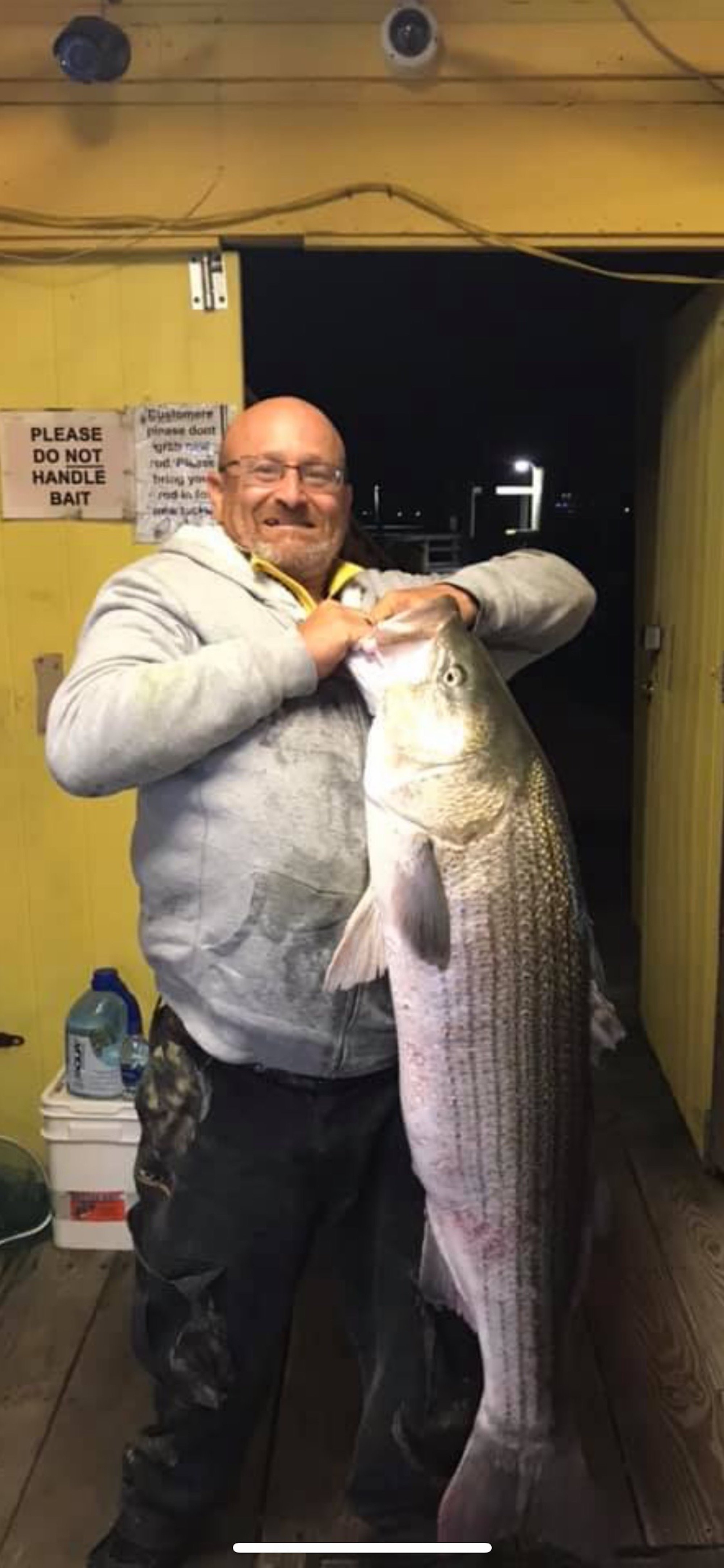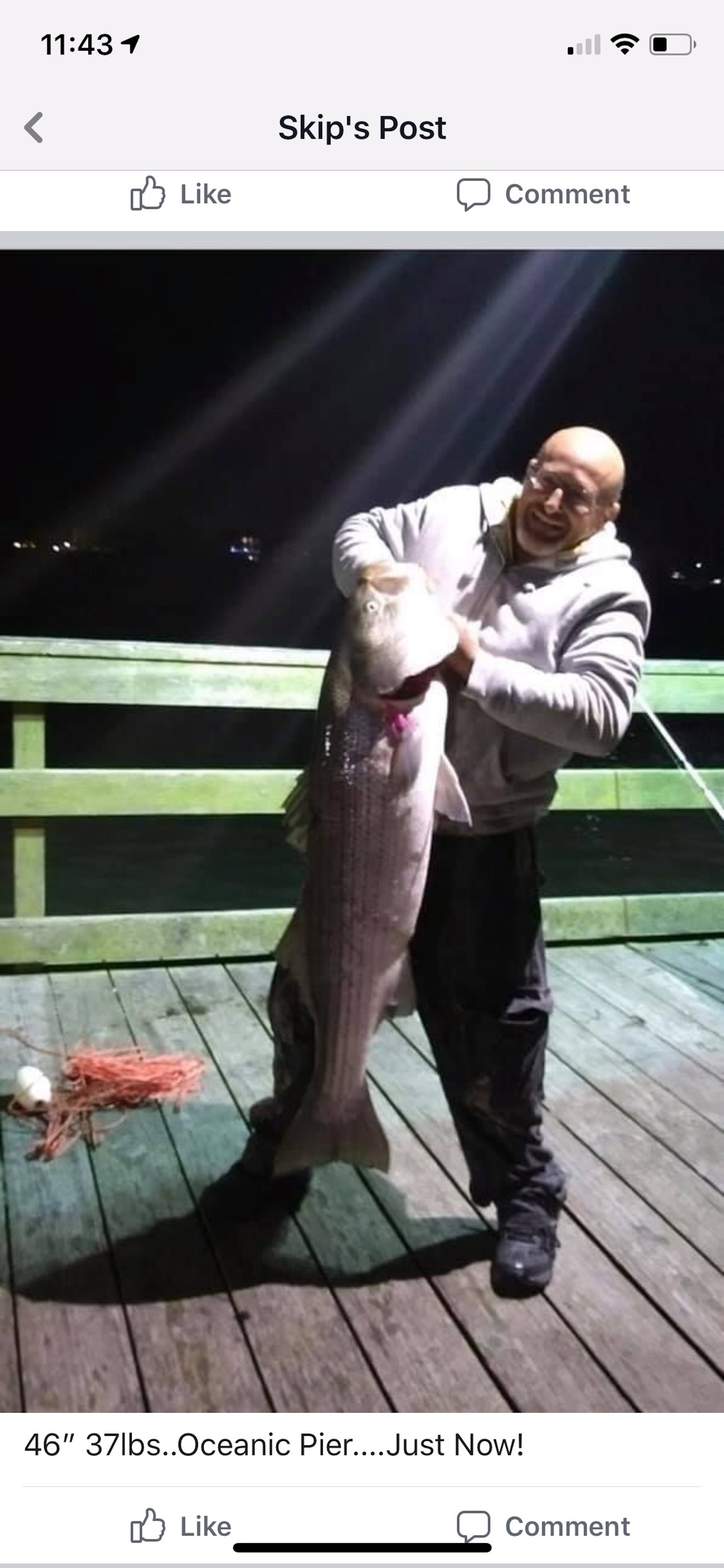 My phone buzzed last night way after yesterday Daily Angle was posted and I was already sawing logs (snoring) so I didn’t even look at the message until first thing this morning. I have to admit I was pleasantly shocked by the photo…..Bear down at the Oceanic Pier got a report from Skip who was working of a BIG rockfish that had been caught off of the pier and sent it to me right away. Dan from Rockville, MD was fishing from the Oceanic Pier last night using Gulp shrimp when he was surprised by this 46″ rockfish that weighed a whopping 37 pounds! Dan was able to keep the fish because it was over the 44″ slot. Awesome fish!