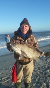 Tom “Bluefish” Berry was fishing Assateague Island today where he caught what we think is the first black drum of the Ocean City surf season. Nice work Tom!