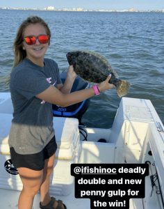 Ben Sterling used the Fish in OC Deadly Double in chartreuse with white Gulp to land two 20″ flounder back to back while fishing the route 50 bridge during the incoming tide.