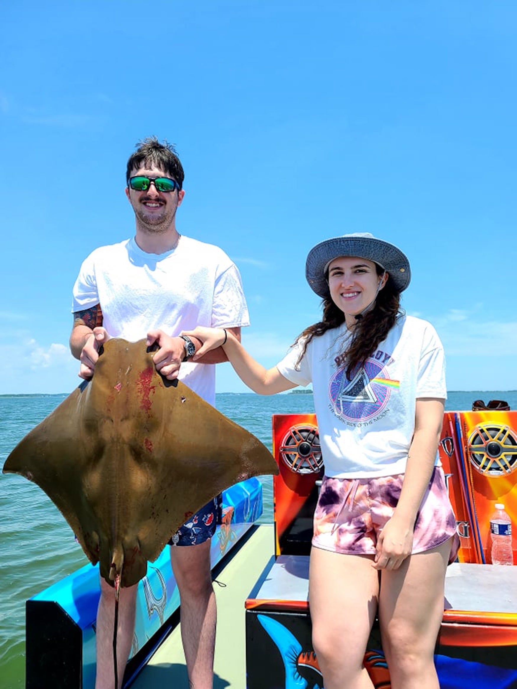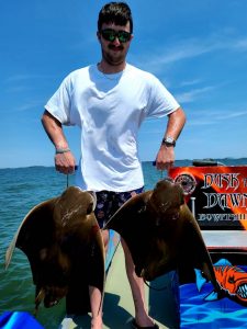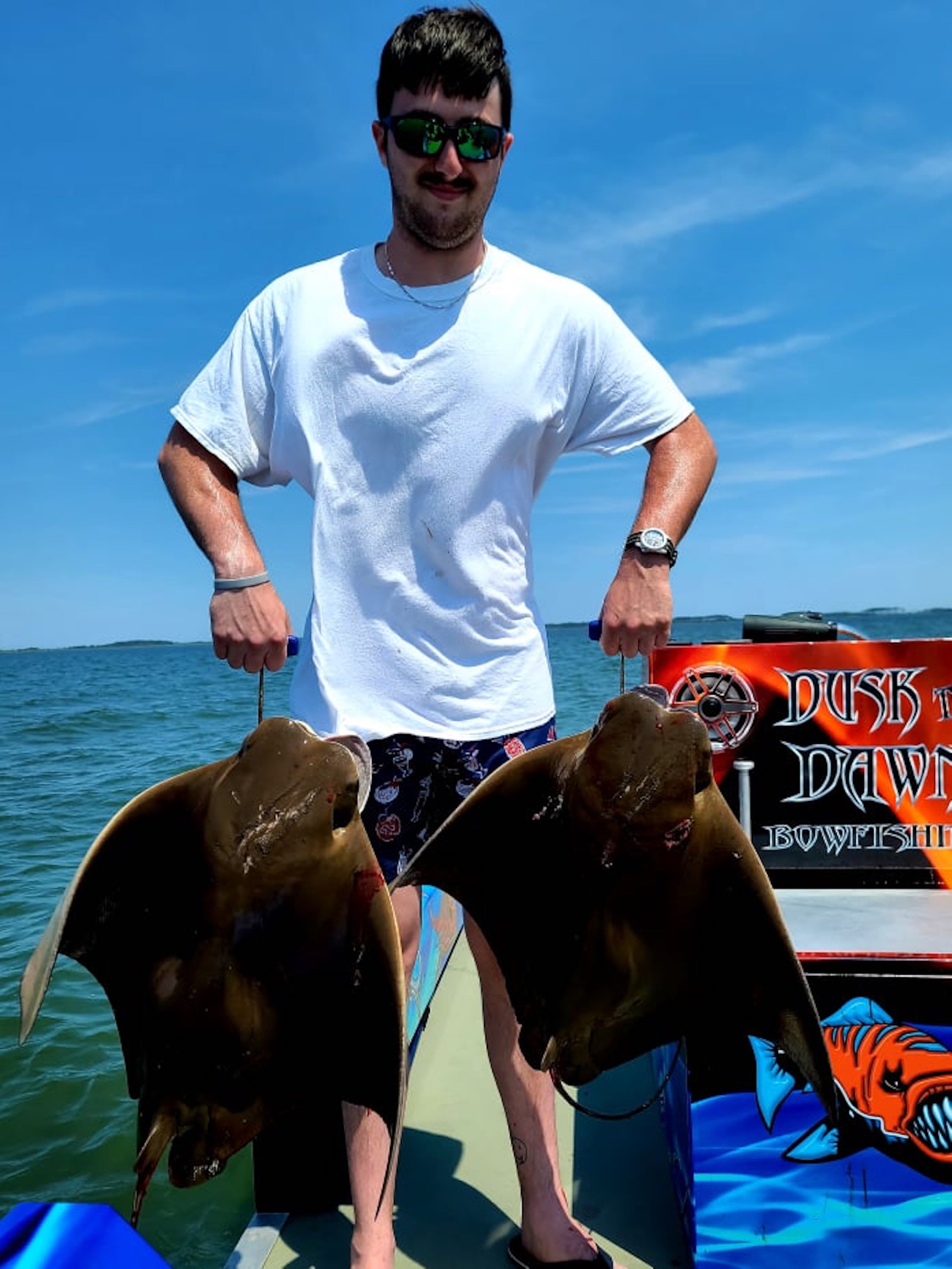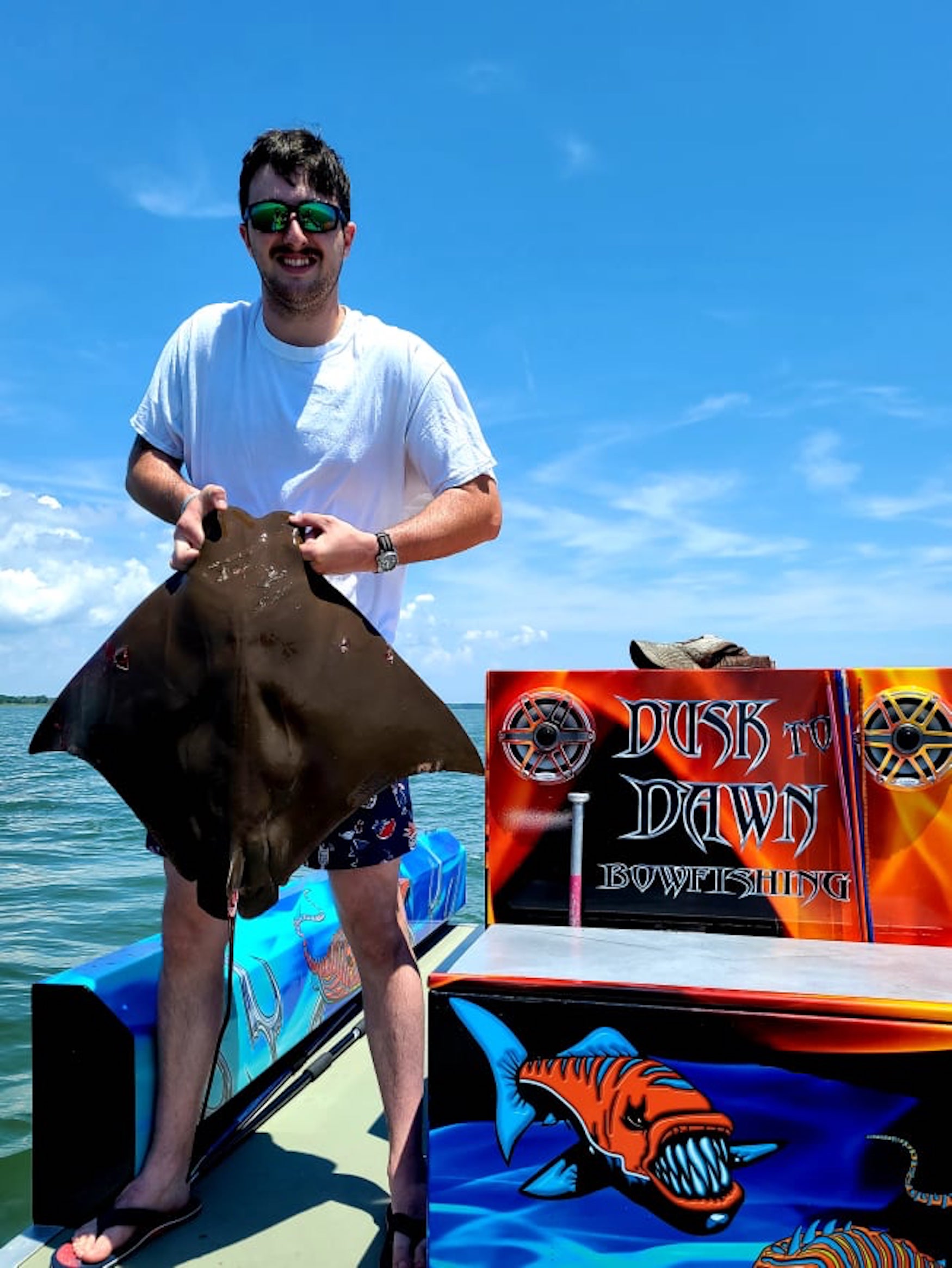 Captain Marc Spagnola of Dusk to Dawn Bowfishing found some clean water and put his shooters on some cow nosed ray action.