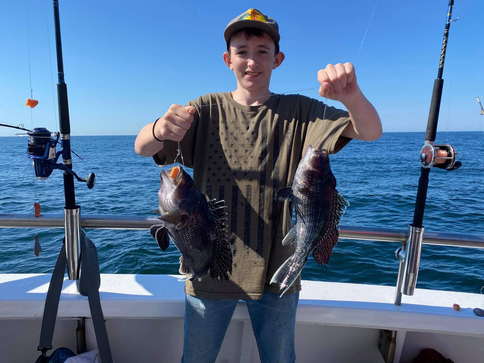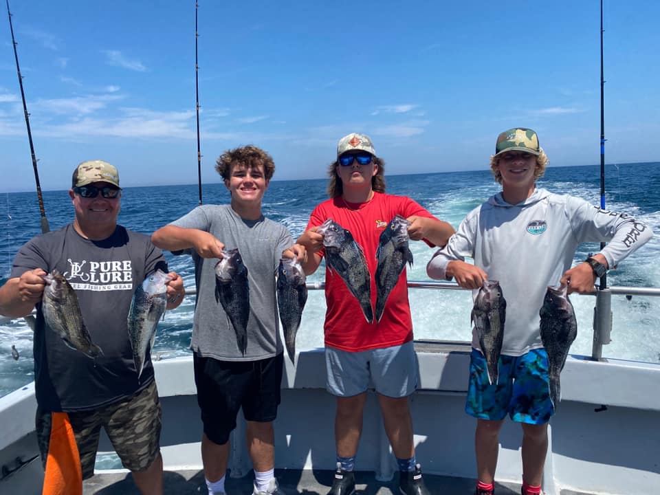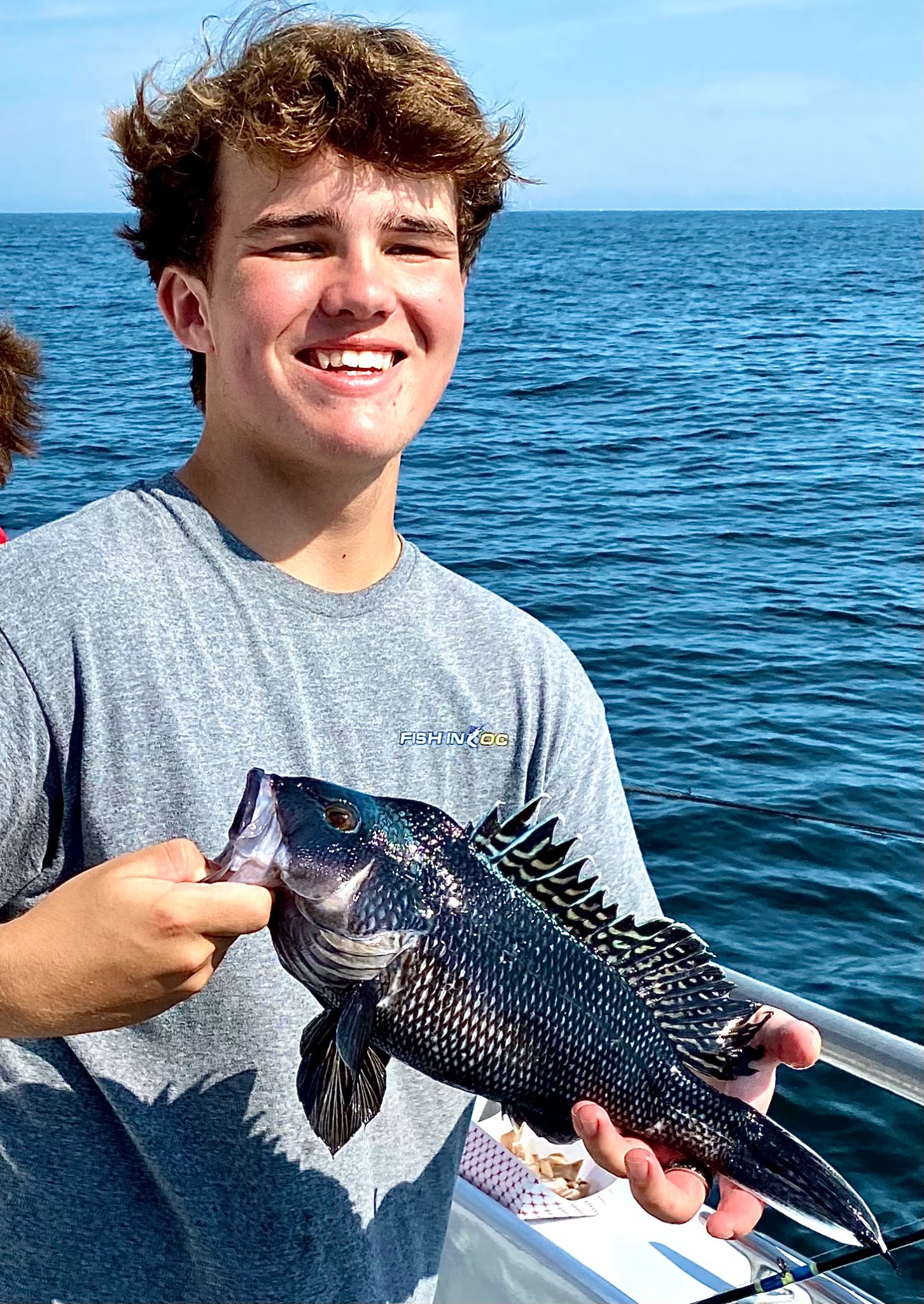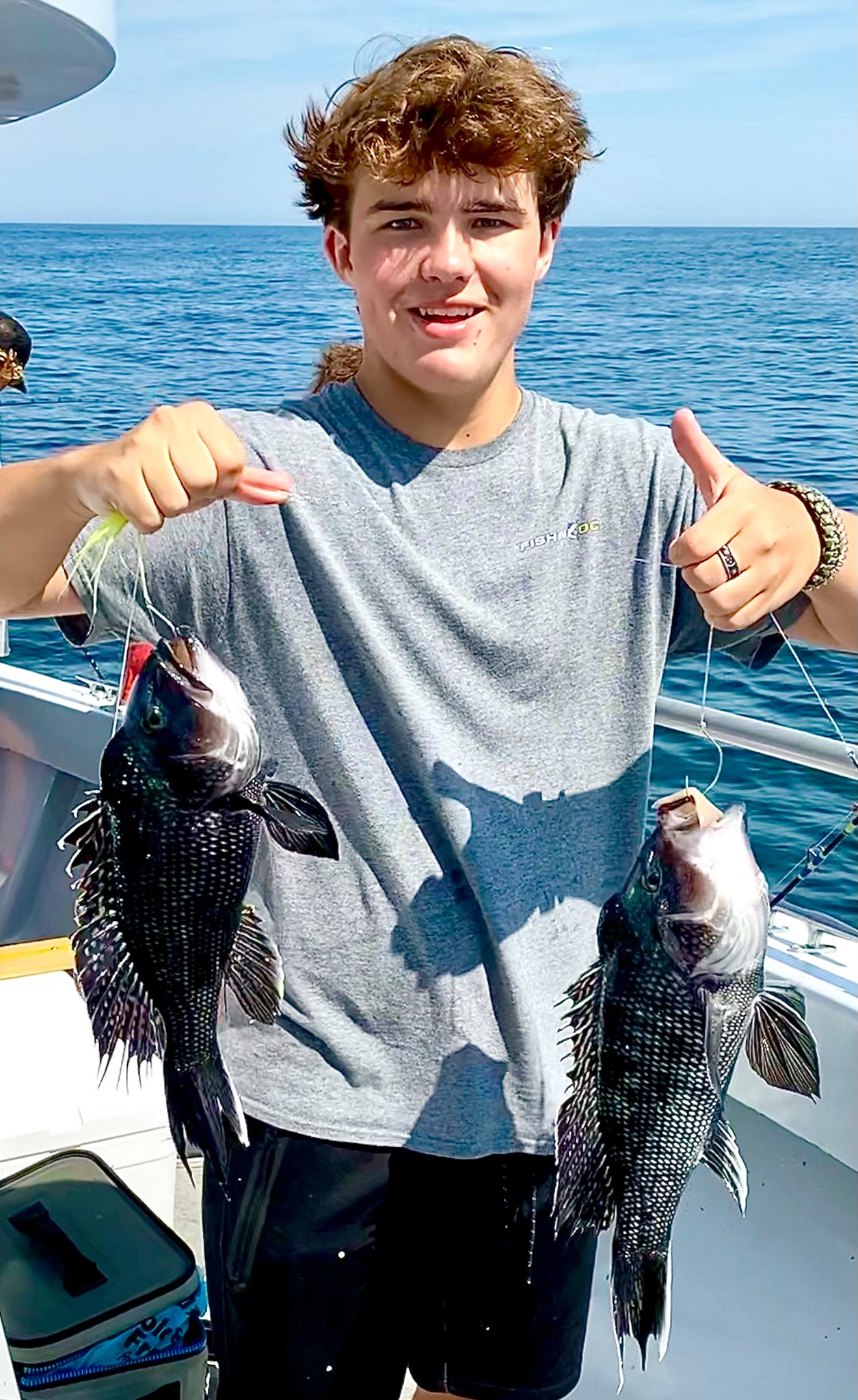 I got to spend the day on board the Morning Star with Captain Monty Hawkins and mates Brian and Victor and it was an awesome day! I was joined by my son Ryan and his buddies from Worcester Prep Dillon Scopp and Owen West and we had an incredible time catching our limit of 60 sea bass. We had several “keeper double” (two keepers on the same rig) and lots of big fish to about 19″. Captain Monty let the boys drop blocks on my dear departed friend Jack Kauffer’s Memorial Reef which was super cool for me and Vic untangled lines and coached them through catching their limit. I caught my first sea bass on a jig and then promptly caught a double keeper on the same jig. It was an awesome trip! Here is is in Captain Monty’s words…