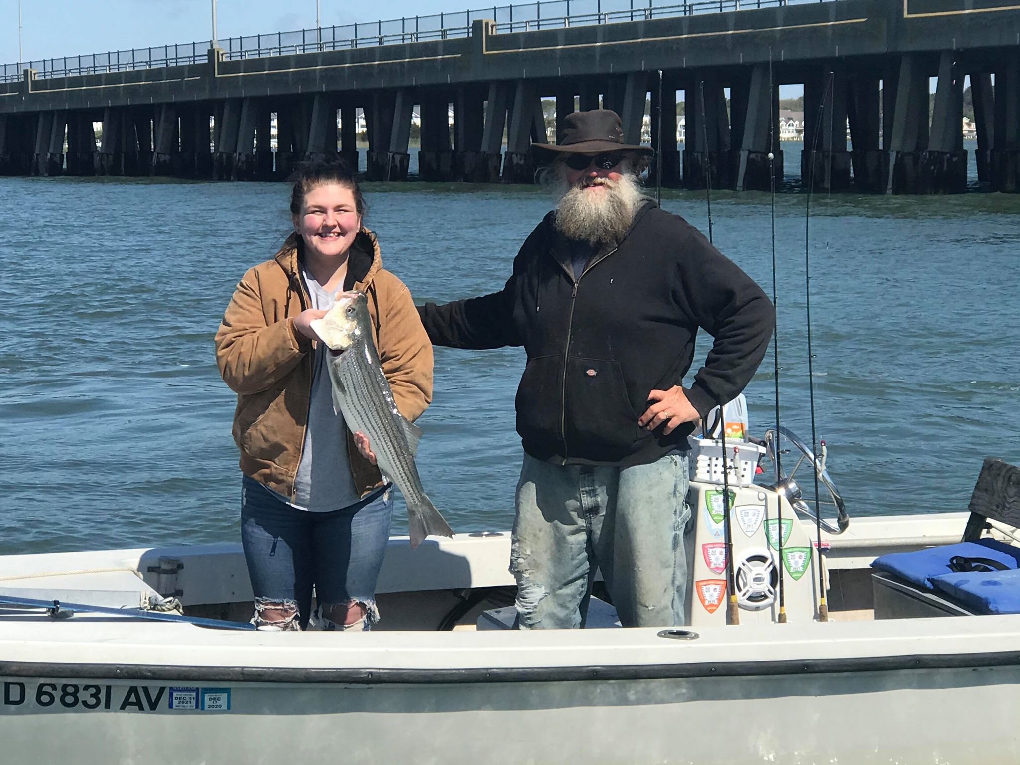 Fishing in OC has been good over the past few weeks with clean water in our back bays and now anglers are catching flounder, tautog, shad, trout, bluefish and rockfish. Few of the rockfish have reached the legal limit of 28″, but yesterday Patricia Cropper caught her first ever keeper rock fishing with her dad Big Bird Cropper. You know that Patricia was using Pop’s World Famous Roy Rig!! Patricia caught the fish at the route 50 bridge and it measured 29″. Photo by Rich Daiker
