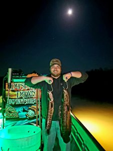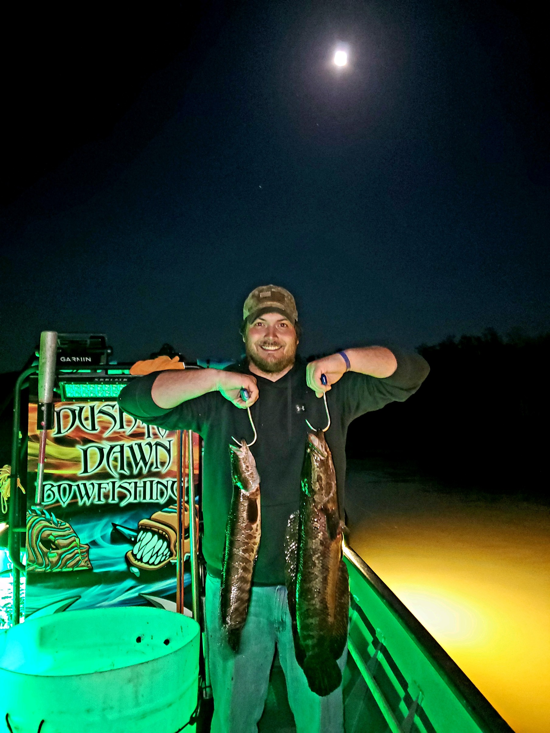 Captain Marc Spagnola of Dusk to Dawn Bowfishing has been hunting by the light of the silvery moon lately and last night he had a good trip once again. Captain Marc had a beautiful night and put his shooters on good action for tasty snakeheads.