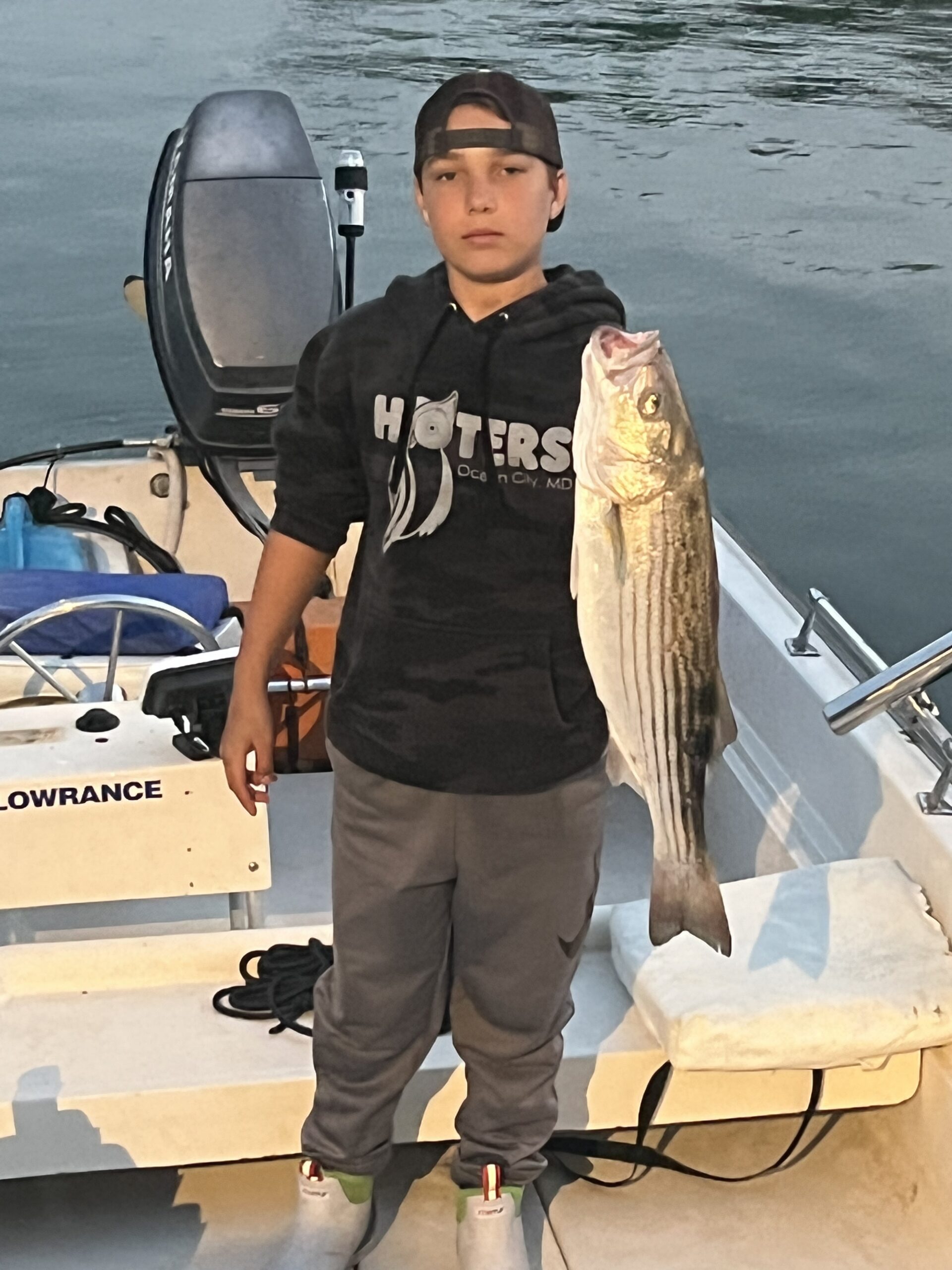 Reece Schindler used a Roy Rig to catch this 28.5” keeper rockfish at the route 50 bridge while fishing with Rich Daiker.