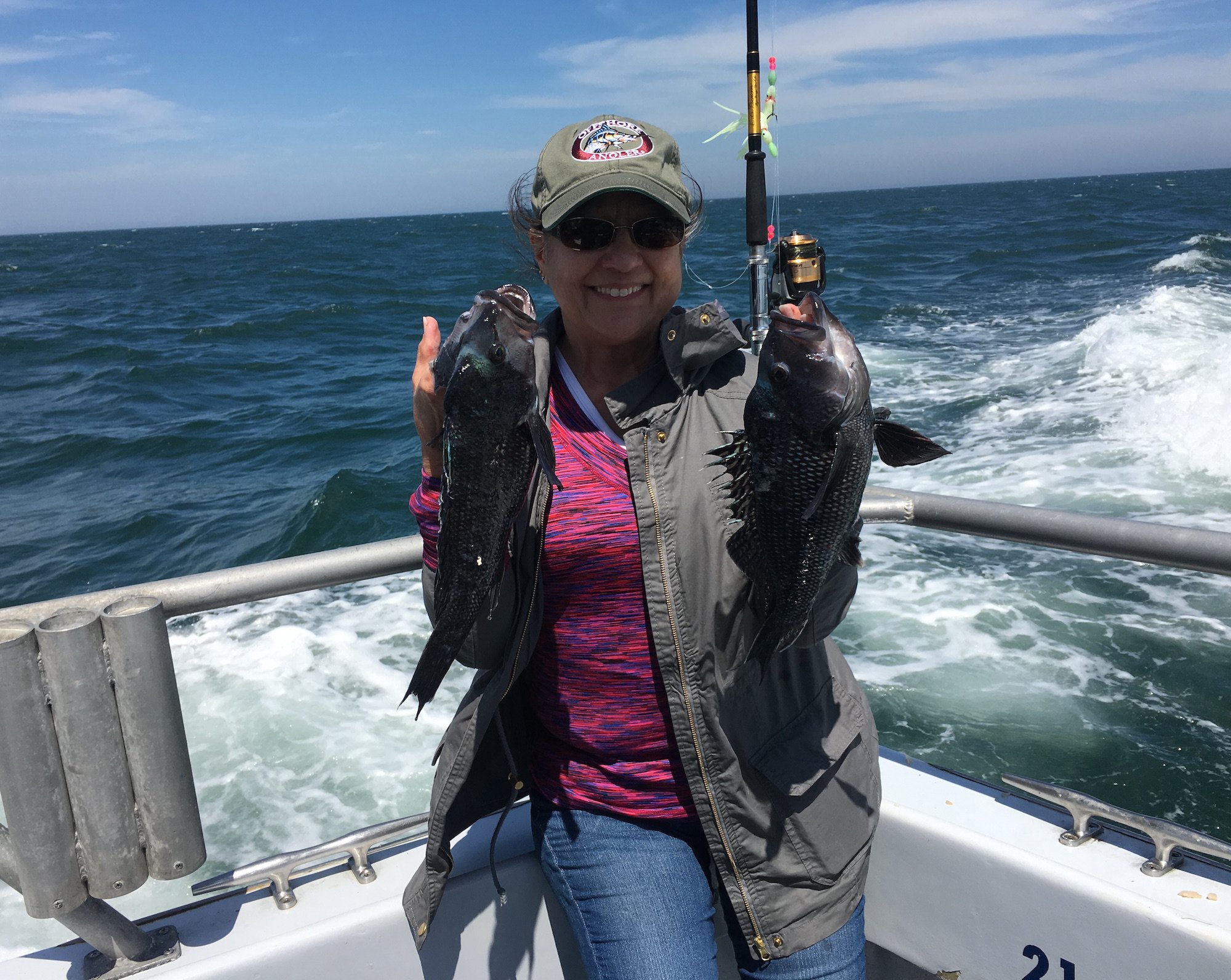 Captain Monty Hawkins of the party boat Morning Star sent in this photo of Nancy Bass (yes that’s her real last name) who took her first trip out in the ocean today with Captain Monty and caught sea bass quite nicely.