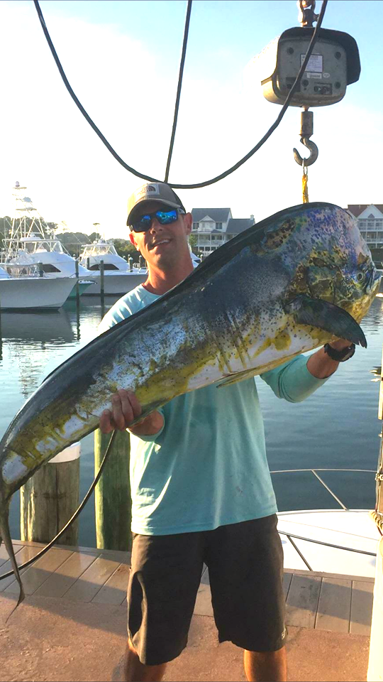 I received a Facebook submission this morning from Captain Bill Vernon of the Big Billin’ out of Indian River with a photo of a HUGE mahi. Captain Bill put angler Chris Middendorf on this beautiful 46 pound mahi in 500 fathoms of the Norfolk Canyon yesterday. The big bull, which is the largest I’ve seen so far this year, came up on a teaser and they switched him to a ballyhoo. The crew also caught five other gaffer mahi.