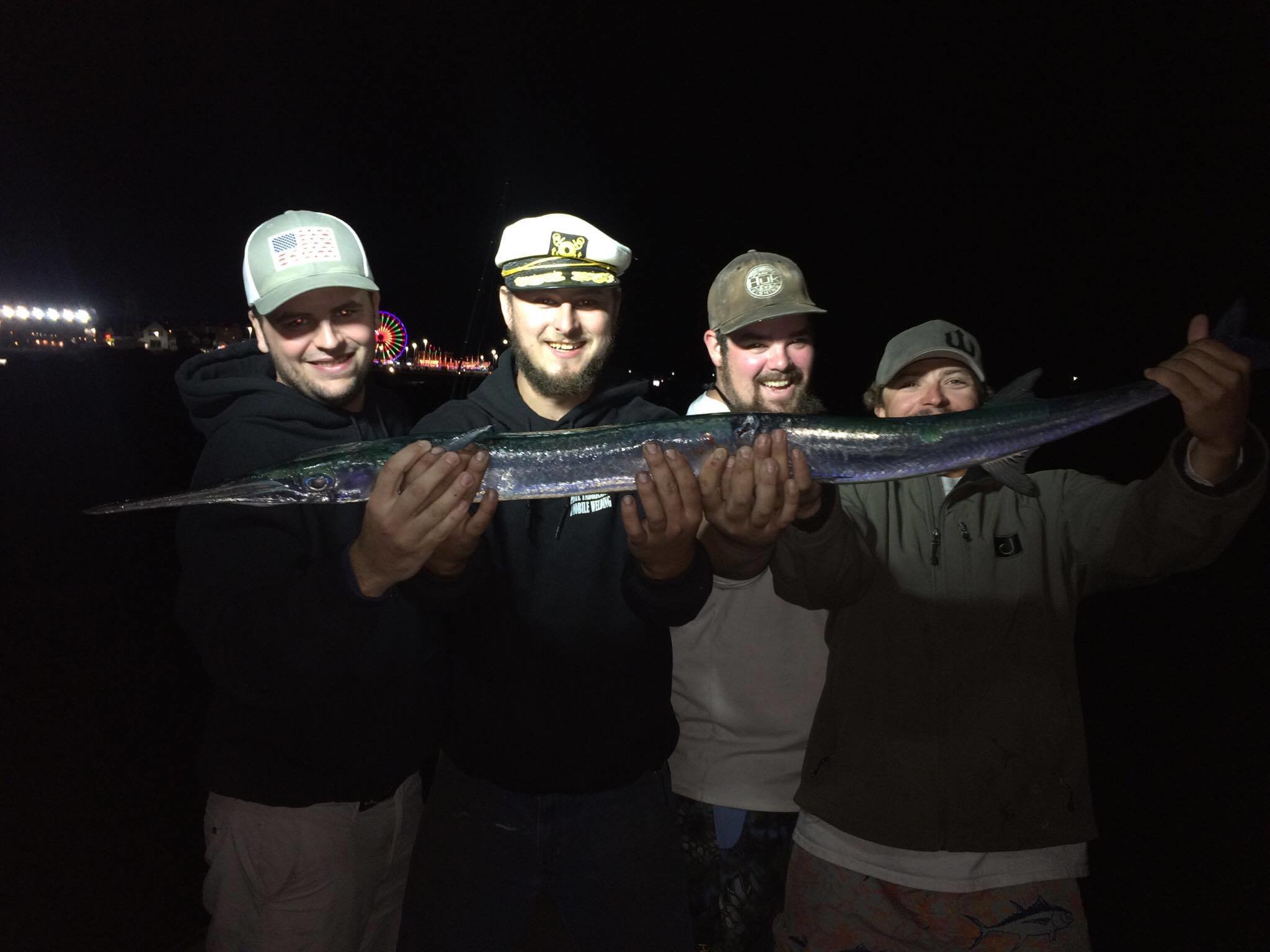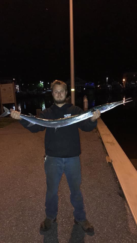 John Meyers sent me this photo of a big gar that Colby Macomber caught on a plug while fishing the south jetty last night…..in the hat he borrowed from the Skipper. Pretty work!