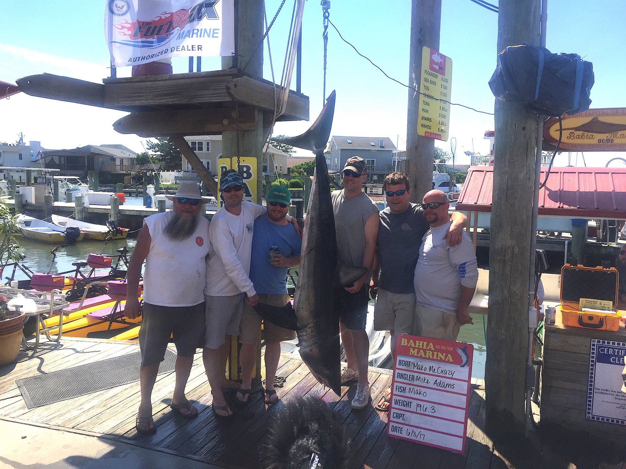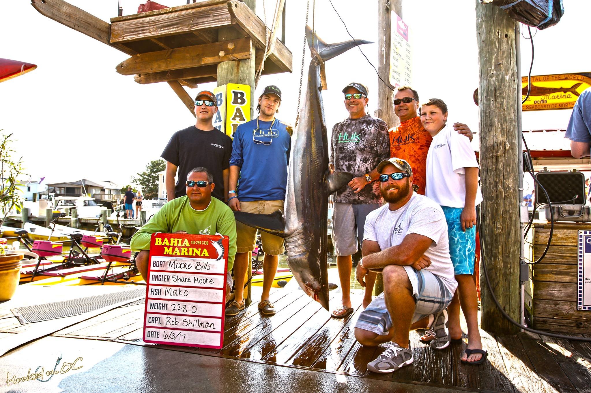 New first place fish in the mako category is a beautiful 228 pound mako caught by angler Shane Moore aboard his Moore Bills. Captain Rob Skillman and mate Brian Behe, Captain of the Buffalo Hunter Guide Service, put shane on the nice 228 pounder and currently the fish is worth over $64,000. Thanks to Dave Messick of Hooked on OC for the great shots.