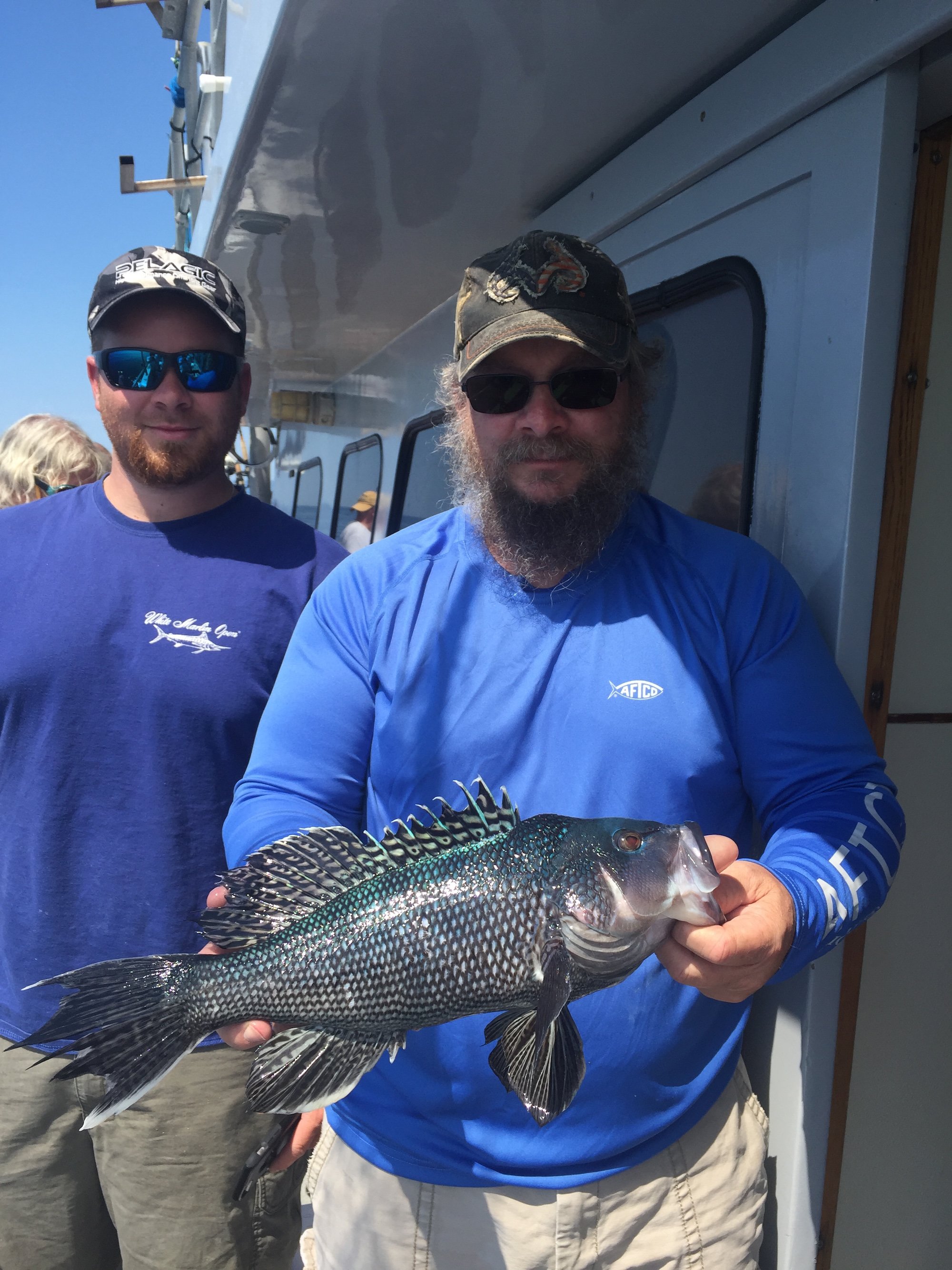 Away from the tournament the sea bass fishing was pretty good today for the ocean going party boats. Captain Monty Hawkins reported a decent bite today with some folks in double digits. Steve and Jacob Hurlock of Littletown, PA show one of the nicer fish from today’s trip.