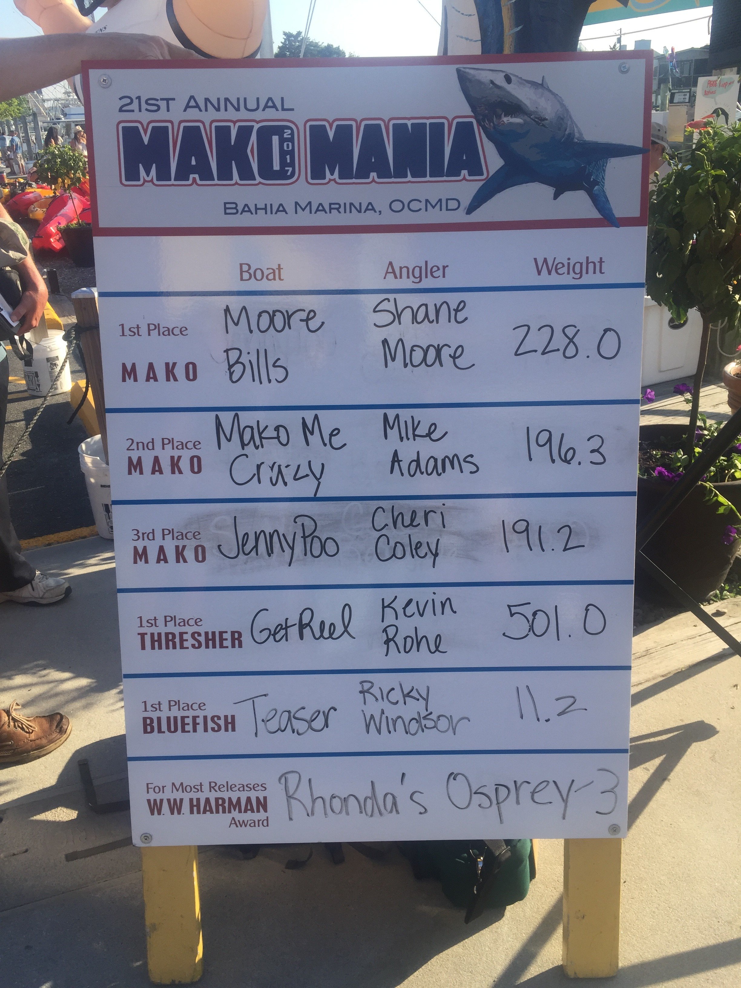 It was another good day at the scales for the second day of the 21st Annual Mako Mania Shark Tournament. Once again there was a boat waiting to weigh a fish when the scales opened at 3:30 and there were some big changes to the leaderboard especially in the mako category. 62 of the 77 registered boats fished today and here’s what the leaderboard looks like after two days of fishing.