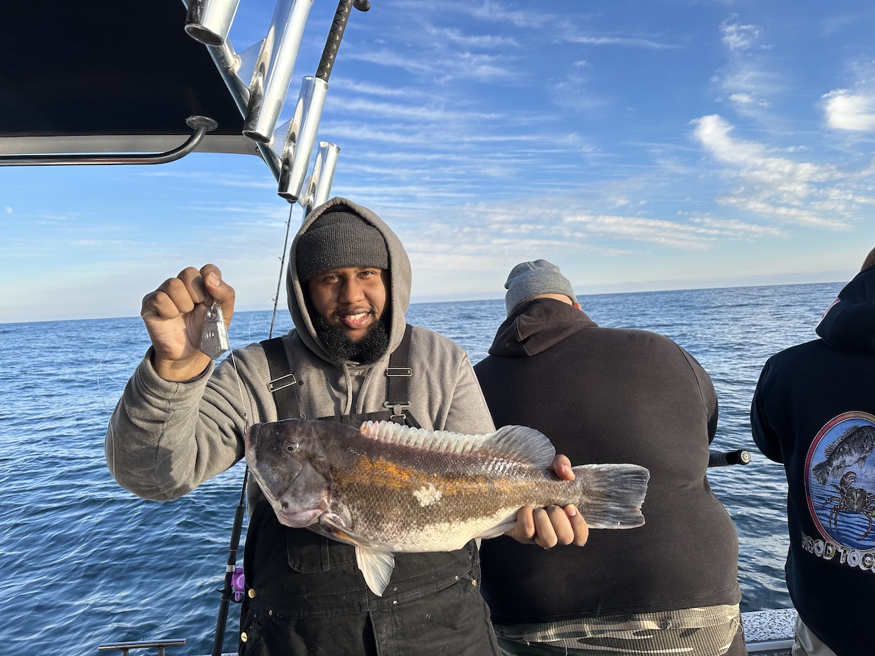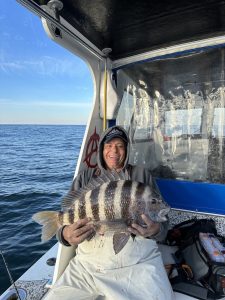 Captain Chase Eberle of Chasin’ Tides Charters jumped through the weather window as soon as it opened this afternoon and was able to put his folks on some good fishing. Captain Chase put his guys on a (self-imposed) three tog per person limit and also had a bonus sheepshead that went 14 pounds. Note: the legal creel limit for tautog in MD is 4 per person at 16″ right now, but many boats are only taking 3 per person.