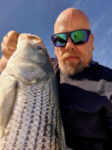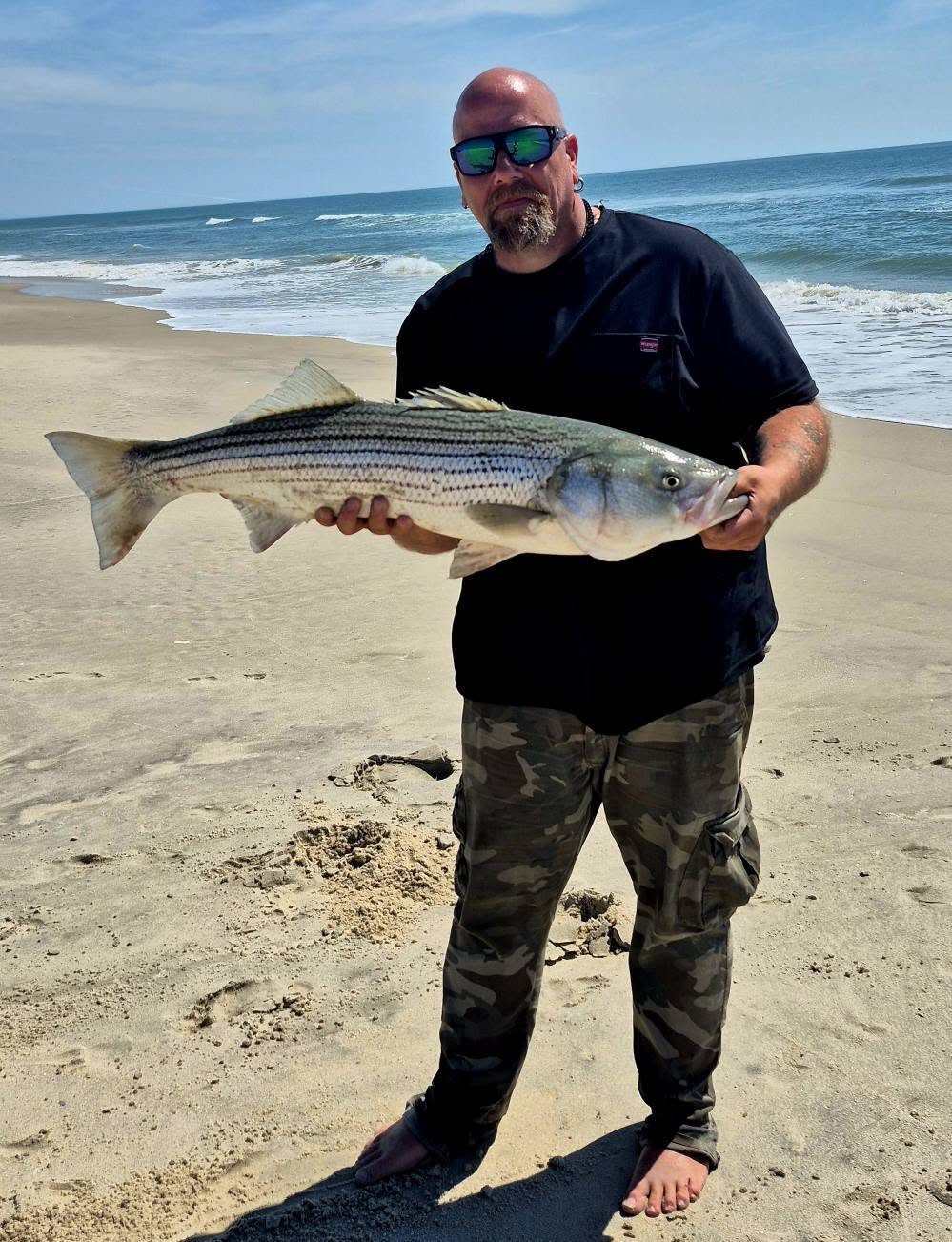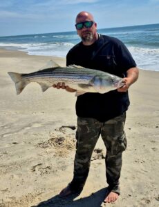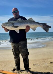 Assateague surf legend David Moore had an awesome day in the surf again today with some very nice striped bass caught and released. David had fish of 34″, 36″, 38″ and a whopping 49″ today.
