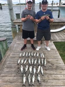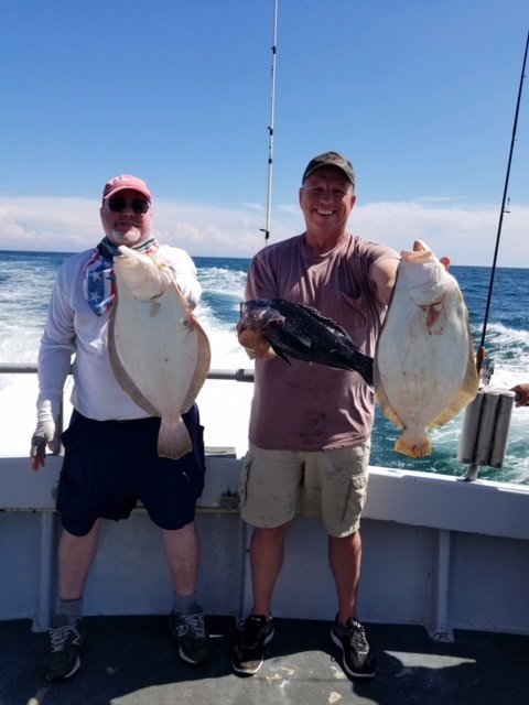 Left, Greg Avedon:Arnold, MD and Ron Peacock of Wilmington,DE display some nice Flounder caught today with Captain Monty Hawkins of the Morning Star. The largest fish was a fat 22″.