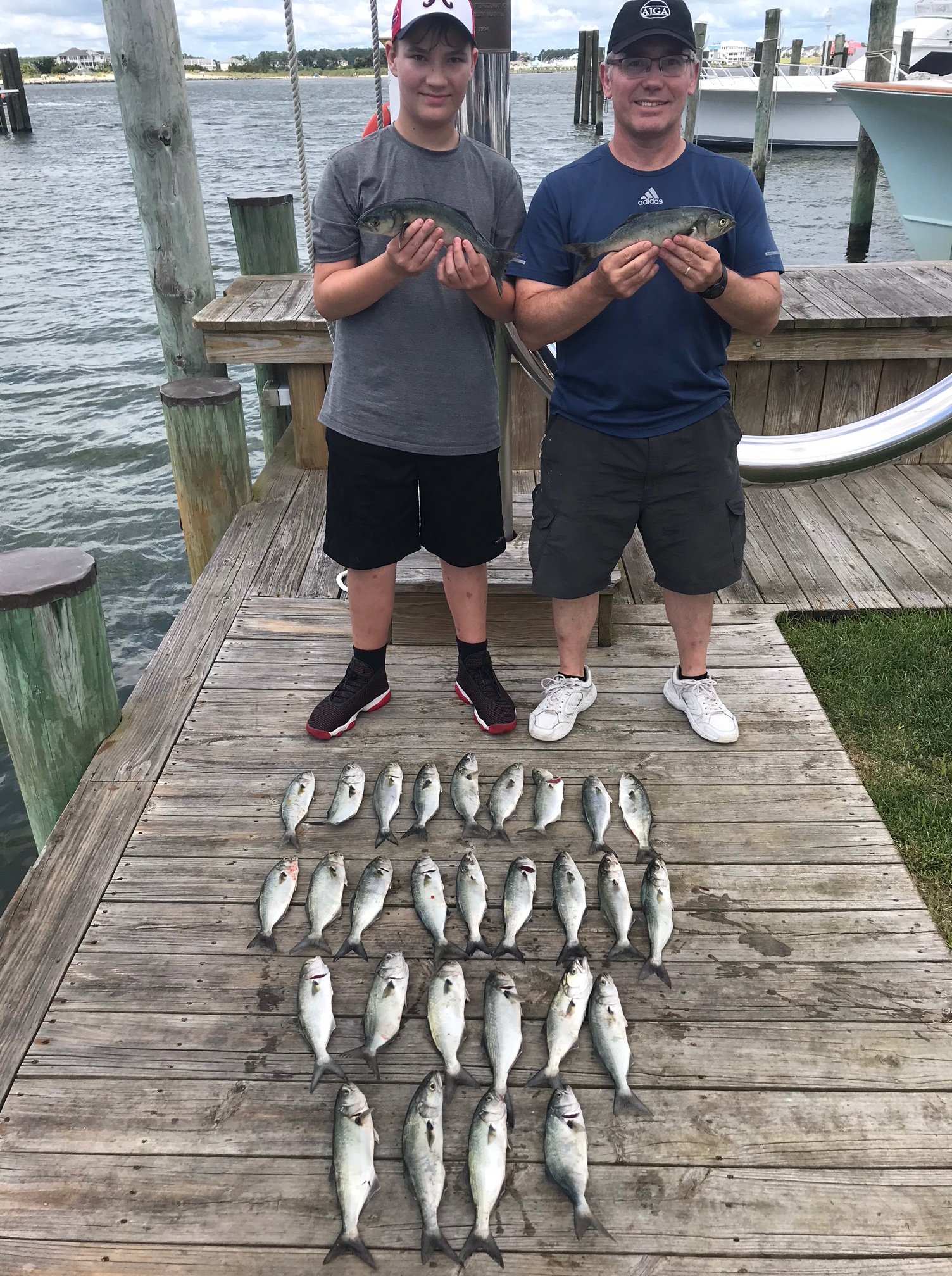 Last night Captain Chase Eberle of Chasin Tides Charters had some really good catch and release shark action with sand tigers over 6’ and today it was an inshore trolling trip with a boat limit of bluefish.