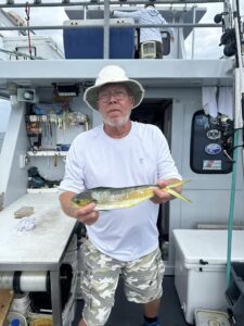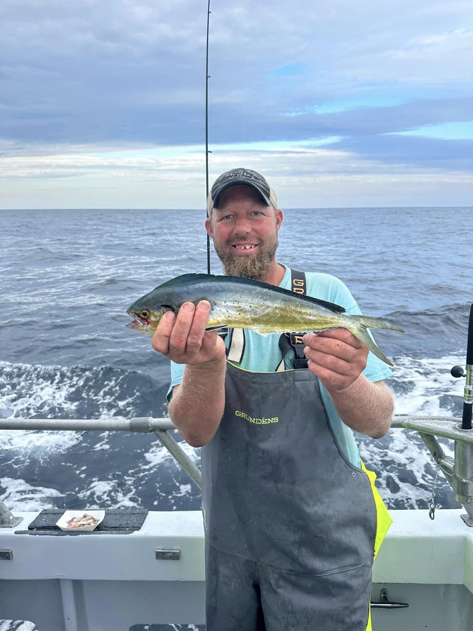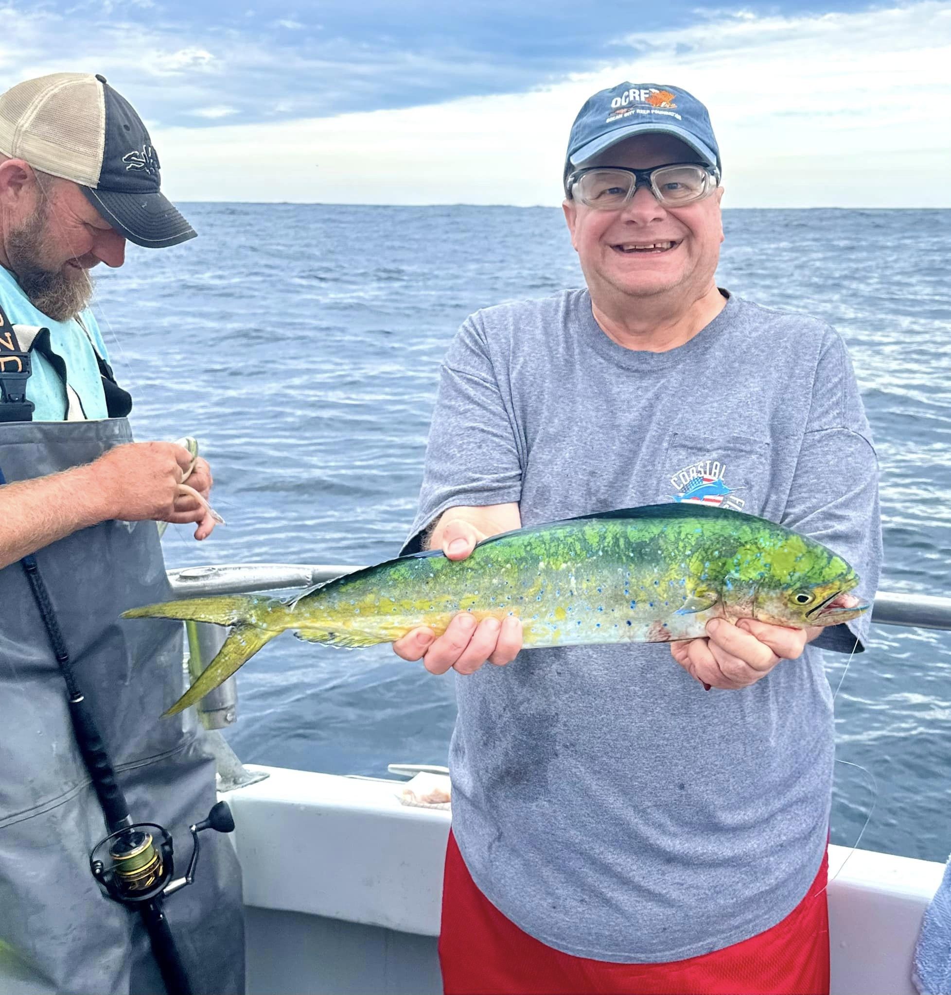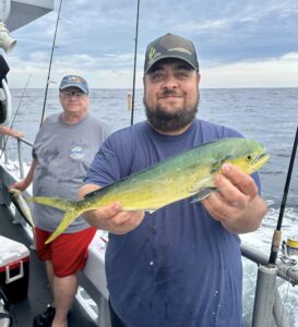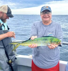 It’s certainly not going to happen often, but today I got a report of a mahi caught just about a mile off of the Ocean City beach. Yup, Captain John Prather and his crew on Ocean City Guide Service were trolling for mackerel, which they caught along with one bonita, when they caught a “peanut” mahi. Most of the mahi that I’ve been reporting lately have been 15-20 miles off the beach with some fish around 10, and even though I’ve heard of fish as close as 5, one mile is the closest I’ve ever seen. You can tell by the photo with the condos in the background, this one an INSHORE mahi! Nice work!