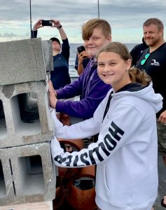 Paddled on off into a nice sunrise. Bit of nip in the morning air lately suggests fall coming. Alyssa and Randy gave the day’s reef blocks a shove, maybe with Dad/Brian’s help. They landed atop Tyler Long’s Memorial Reef – a brand new barge we sank in May – where they’ll add complexity to an otherwise flat steel deck.