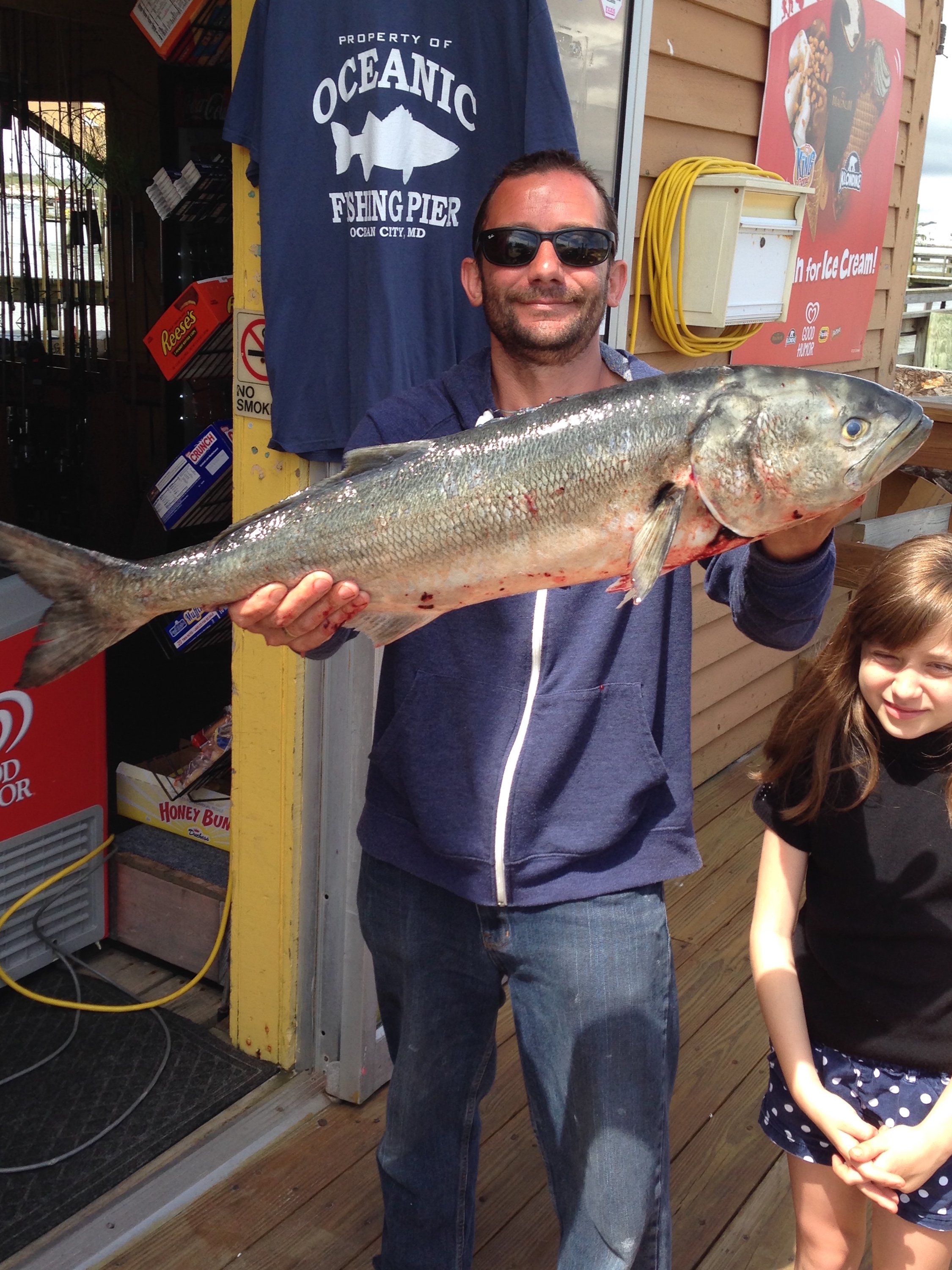 Bear at the Oceanic Pier reports some more good bluefishing from the route 50 bridge, the north sea wall and the pier. Anatoli Georgiev caught this nice 32″ bluefish on a gotcha plug and weighed it at the pier this morning.