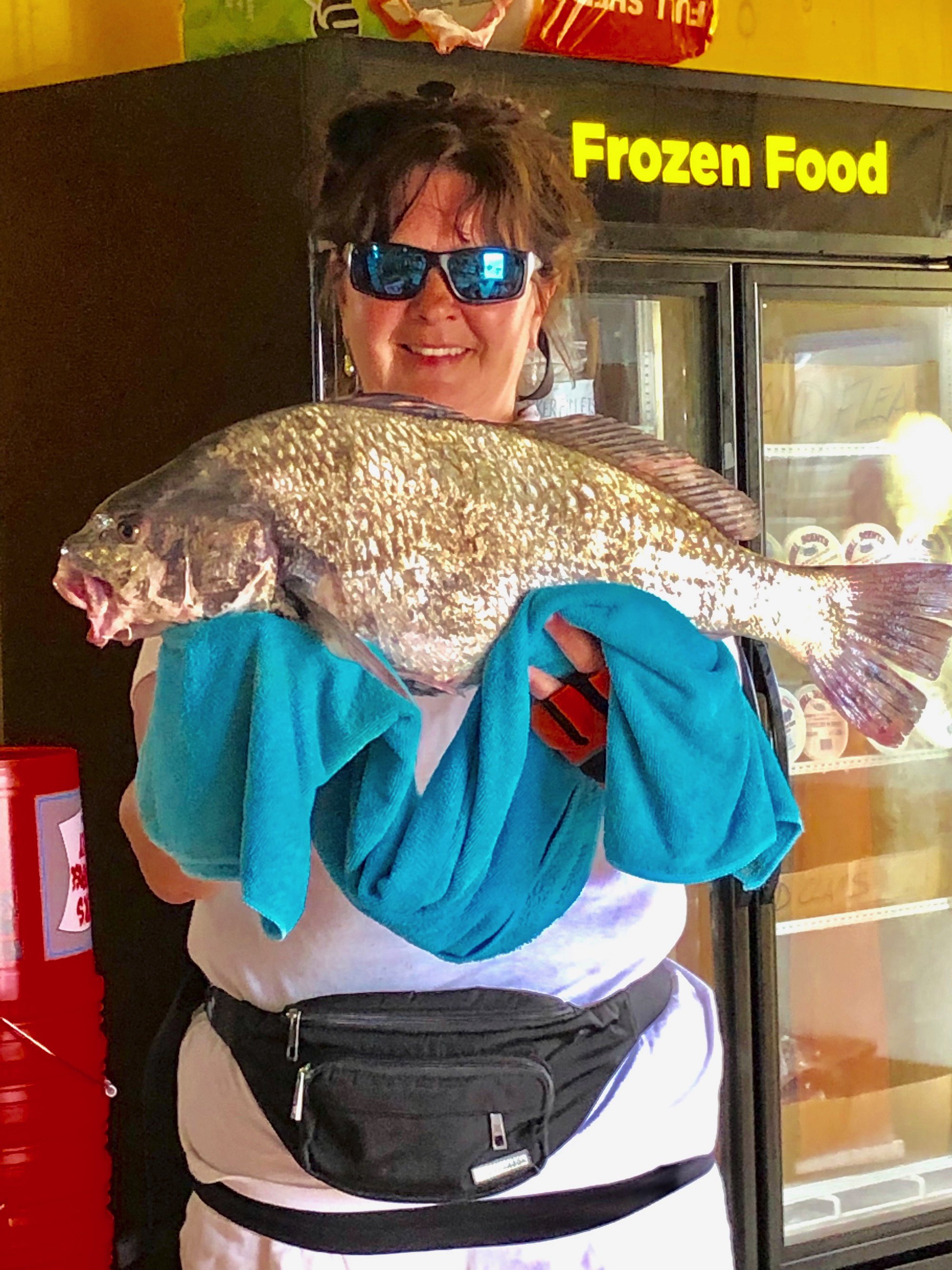 Christy caught this beauty of a black drum on a sand flea at the north jetty and took it to Bear down at the Oceanic Pier for a photo.