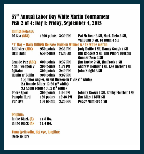 Today was probably the last day for a couple that will be comfortable fishing offshore. Tomorrow’s forecast is for E to NE winds 15-25 knots and seas of 5-7 feet, not nice, and Sunday it’s supposed to diminish to 10-20 knots and 4-6 feet but still blow out of the east so it will probably still be sporty. The Ocean City Marlin Club made a good call and added an extra fishing day to the 57th Annual Labor Day White Marlin Tournament because of that forecast so most of the boats will use today and Monday as their two fishing days out of the four. There was some good fishing today down below the Norfolk canyon but it was a good 90 mile run. If you decided to make the trip, it was worth it for some. After one day of fishing the leader board looks like this.