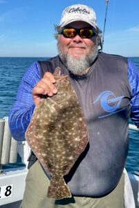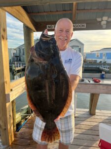 Walter Andrews used a live spot in the east channel to catch this doormat flounder that was his personal best at 25” and 7.8 pounds.