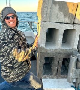 Bob, a Rt 54 local, volunteered to do the deed with today’s twenty reef blocks. We sent them loose down to Kathy’s Reef, one of a great many reefs sponsored by Dick Arnold..