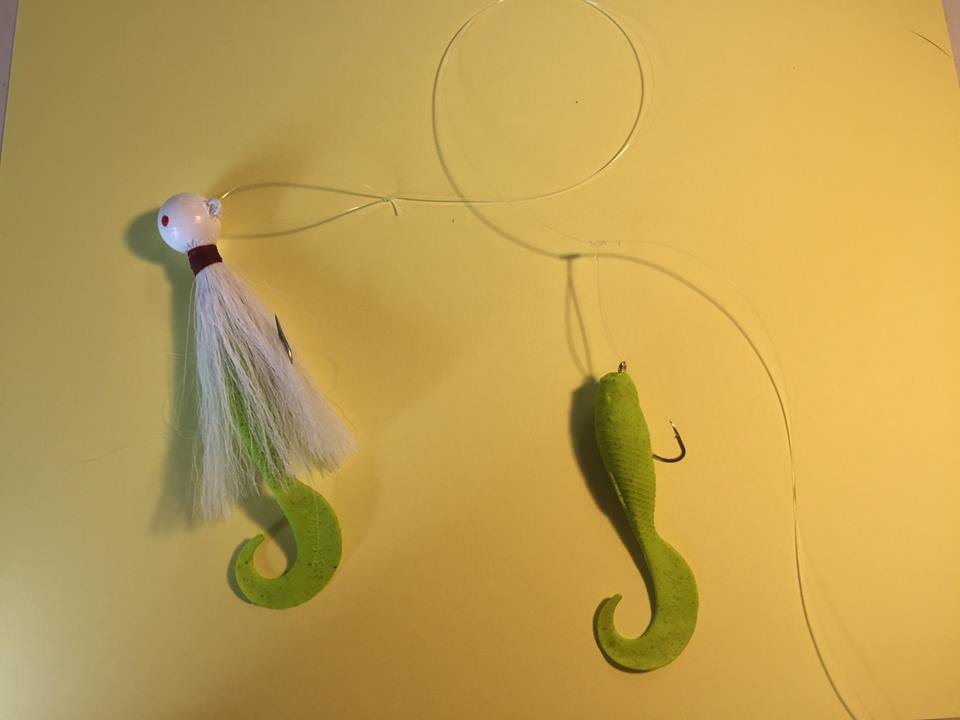 * For baits, I use Gulp swimming mullets. 5” on the bottom bucktail, 3”-4” on the teaser hook. I like chartreuse, pink & white. When they’re really hungry, the type of Gulp doesn’t really matter too much. When I run out of the bigger bucktail Gulps, the smaller Gulps will still work on the bucktail.