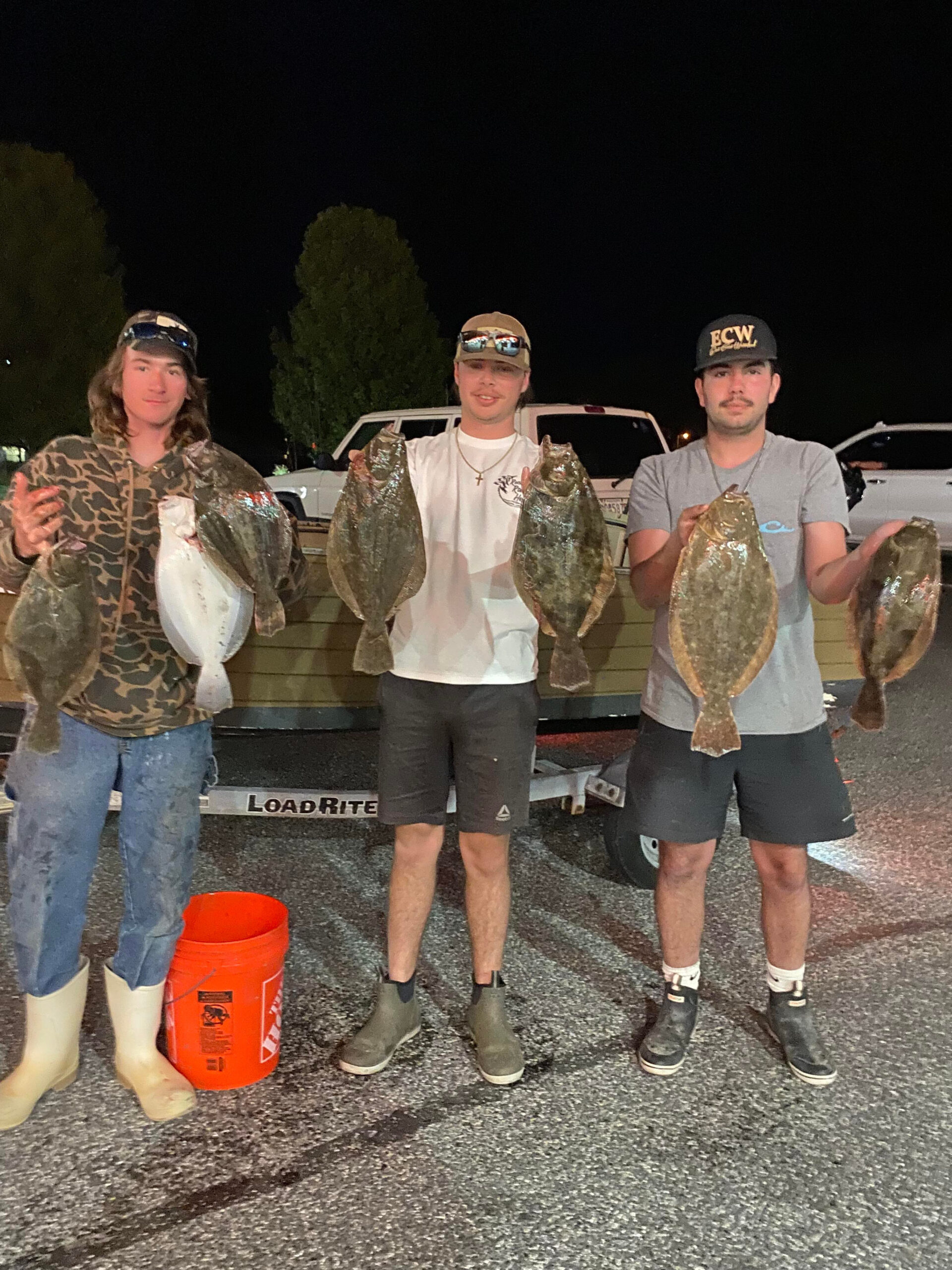 Chris Tilghman, Mike Tuel and Danny Oliver hit Wachapreague, VA today after our awesome report a they made themselves an awesome report. The guys had a limit of flounder up to 21.5″ with several nice fish. Like us yesterday, the guys found the flounder spitting up very small mantis shrimp.