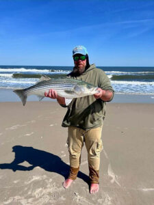 David Moore was surf fishing Assateague Island in today’s beautiful weather and latched into this 38” rockfish that was released.