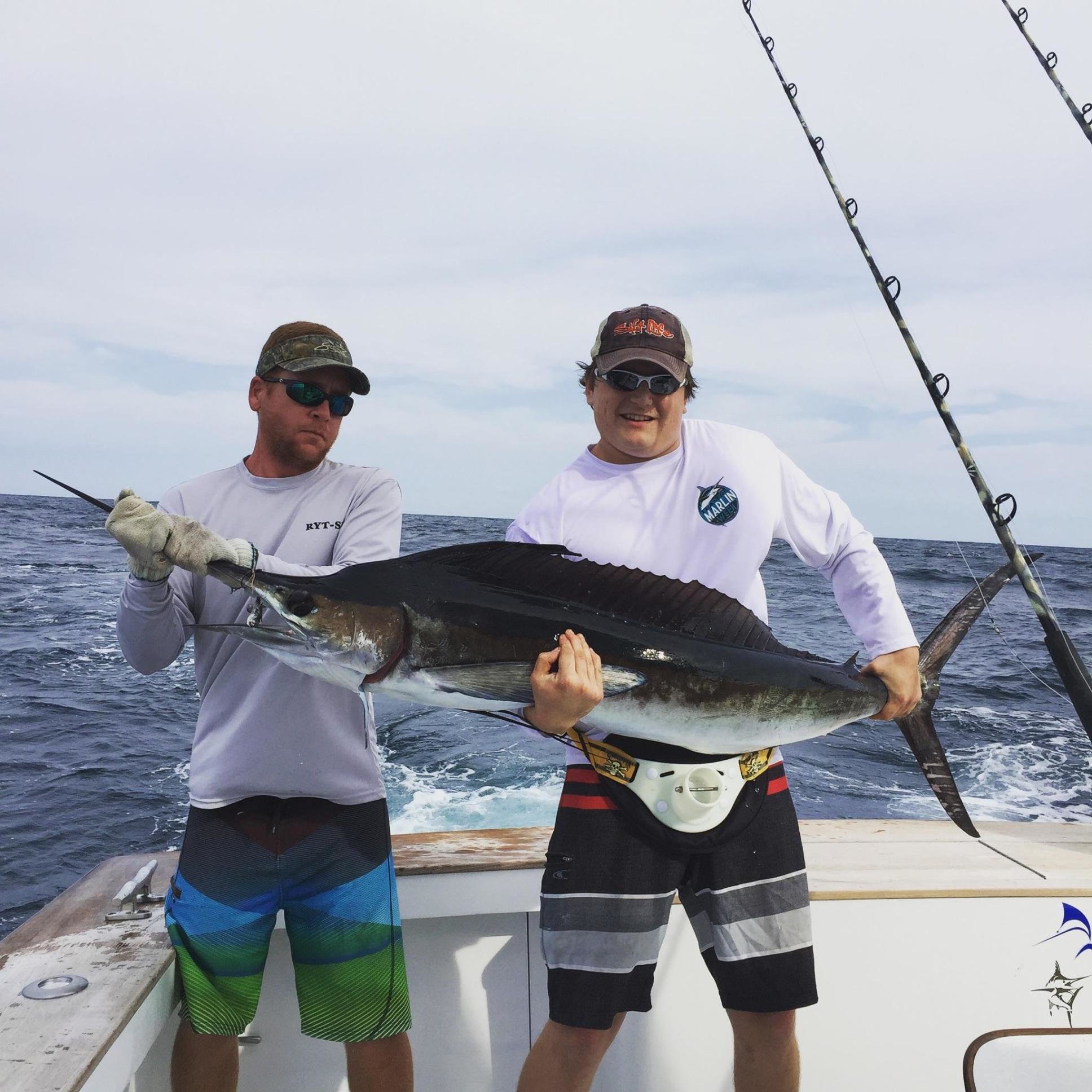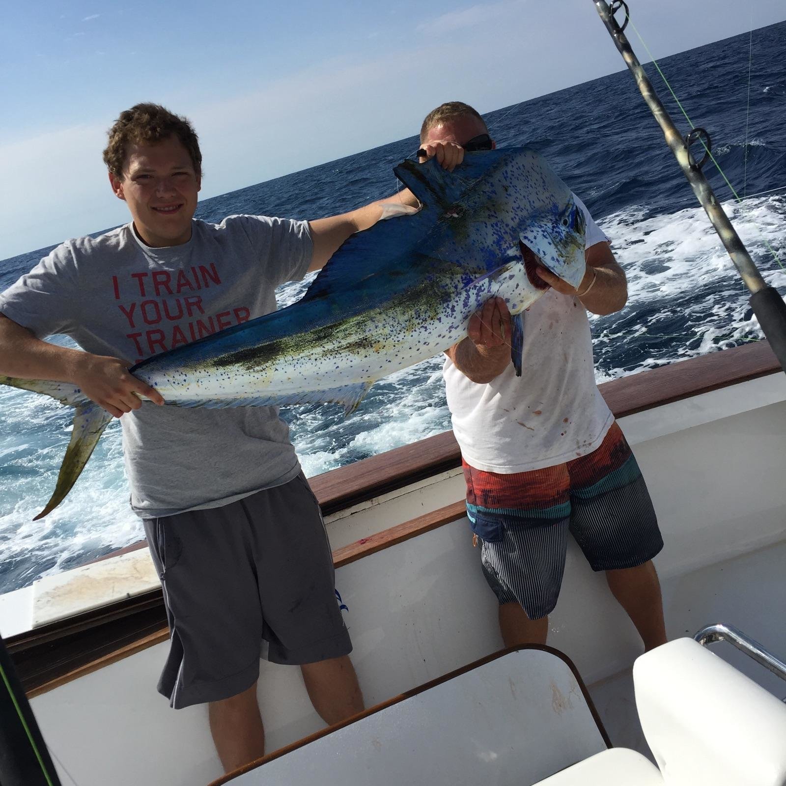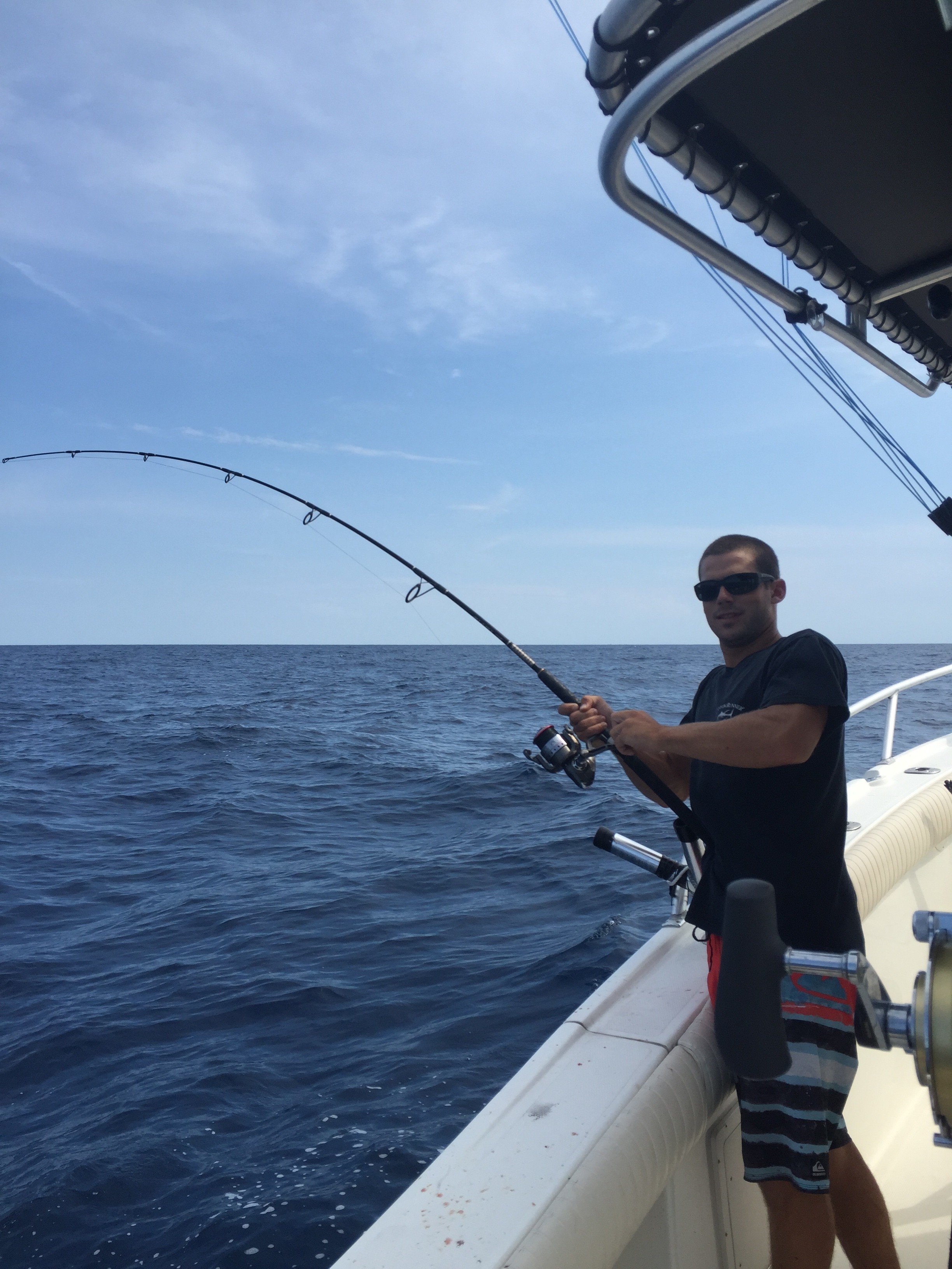 One of my regular contributors Austin Ensor went to the deep on an overnight trip last night and returned with a report of 10 mahi, one yellowfin, 15 bar jacks and they also released some small bigeye and a mako. Here is Austin having some fun on spinning gear.