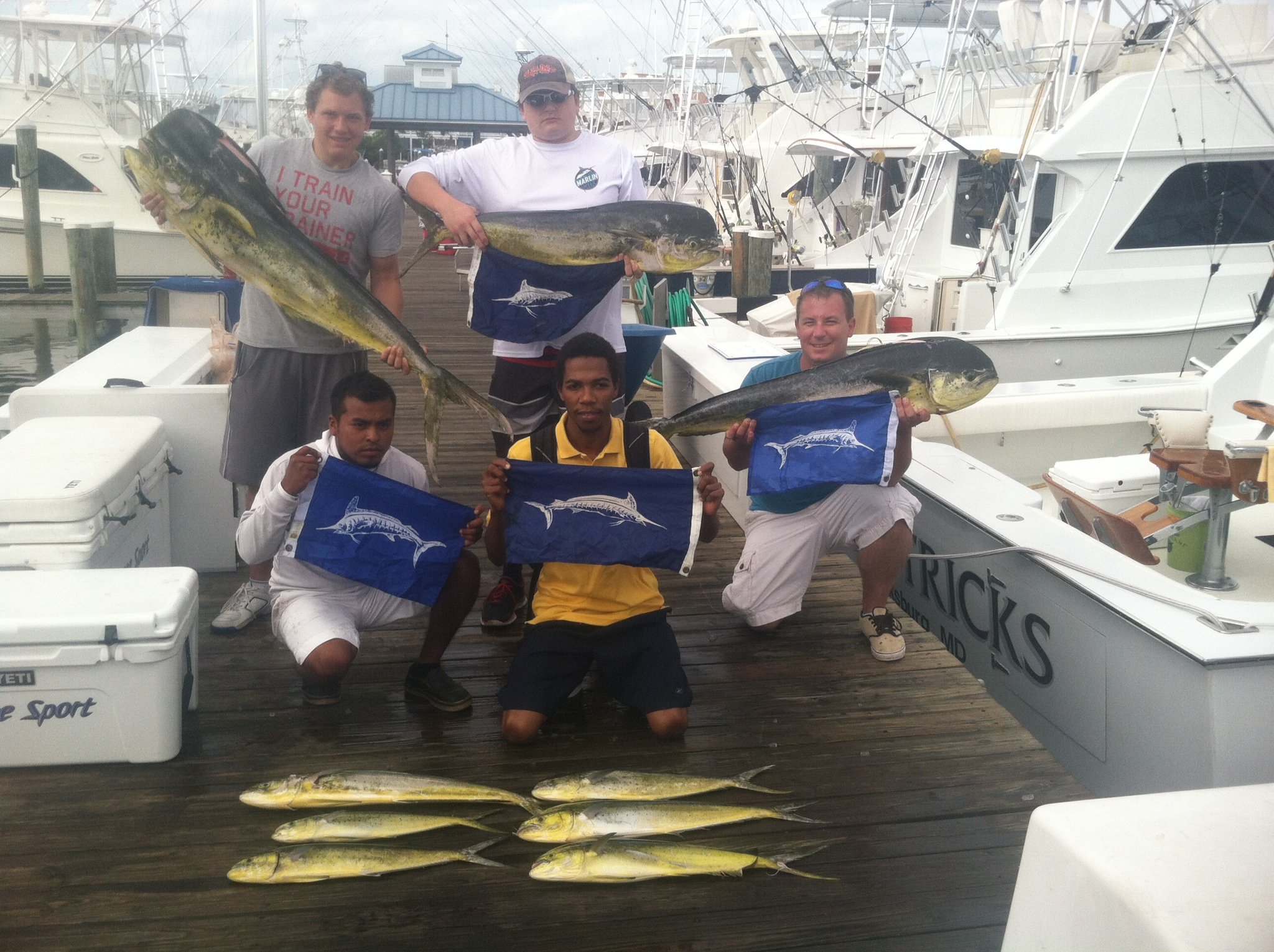 This makes two days in a row that I have gotten an awesome report from Captain Joe Drosey fishing on board Rhonda’s Osprey out of Sunset Marina. Captain Joe has been having some really good luck recently with the white marlin and mahi in the canyons. Rhonda’s Osprey finished with 3rd most white marlin points in last week’s MidAtlantic Tournament, and continued his fish catching ways today. Captain Joe and crew put this party on six bailer size mahi, three gaffer size fish (including a large bull) and four white marlin releases. They also got some great shots of the action while they were out.