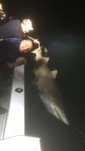 Captain Chase Eberle finished up his trip last night with some really good shark fishing action. The group added four more shark releases to their total and Matt Blakeley reeled in this monster 102″ sand tiger shark.